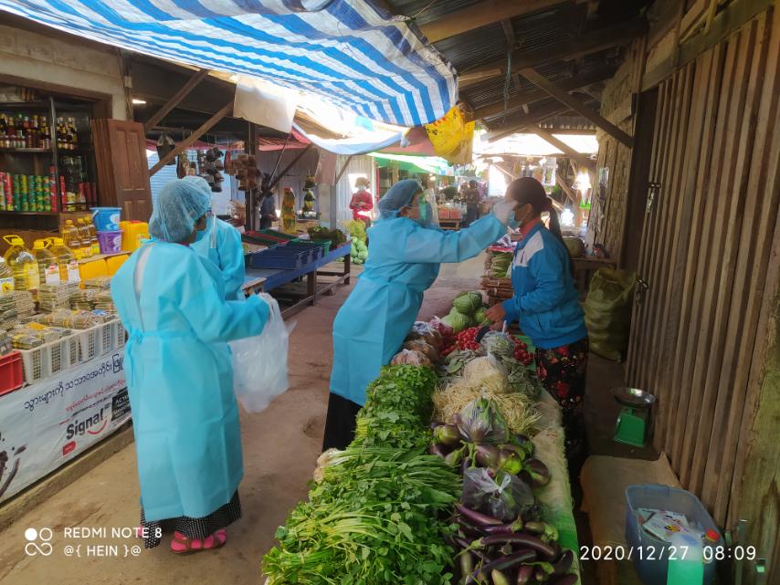နေအိမ်ပြင်ပသို့ သွားရောက်သည့်အခါ နှာခေါင်းစည်း တပ်ဆင်ခြင်းမရှိသည့် လမ်းသွား လမ်းလာများ၊ မြို့နယ်ရှိ ပြည်သူများကို ပါးစပ်နှင့် နှာခေါင်းစည်းကို စနစ်တကျတပ်ဆင်စေခြင်း၊ တစ်ဦးနှင့်တစ်ဦး ခပ်ခွာခွာ နေထိုင်လုပ်ကိုင်ခြင်း၊ လက်ကို ဆပ်ပြာ၊ လက်သန့်စင်ဆေးရည်ဖြင့် မကြာခဏဆေးကြောခြင်း၊ တစ်ဦးကိုတစ်ဦး အသိပေးခြင်းနှင့် သတိပေးခြင်း၊ မြို့မဈေးသို့ မဖြစ်မနေ ဈေးရောင်း/ဈေးဝယ်သူများ အနေဖြင့် နှာခေါင်းစည်းတပ်ဆင်၍ ဈေးရောင်း/ဈေးဝယ်မှုများ ဆောင်ရွက်စေခြင်း စသည့် ကိုဗစ်-၁၉ ရောဂါဆိုင်ရာ အသိပညာပေး လုပ်ငန်းများ ဆောင်ရွက် ခဲ့ကြောင်း သိရသည်။