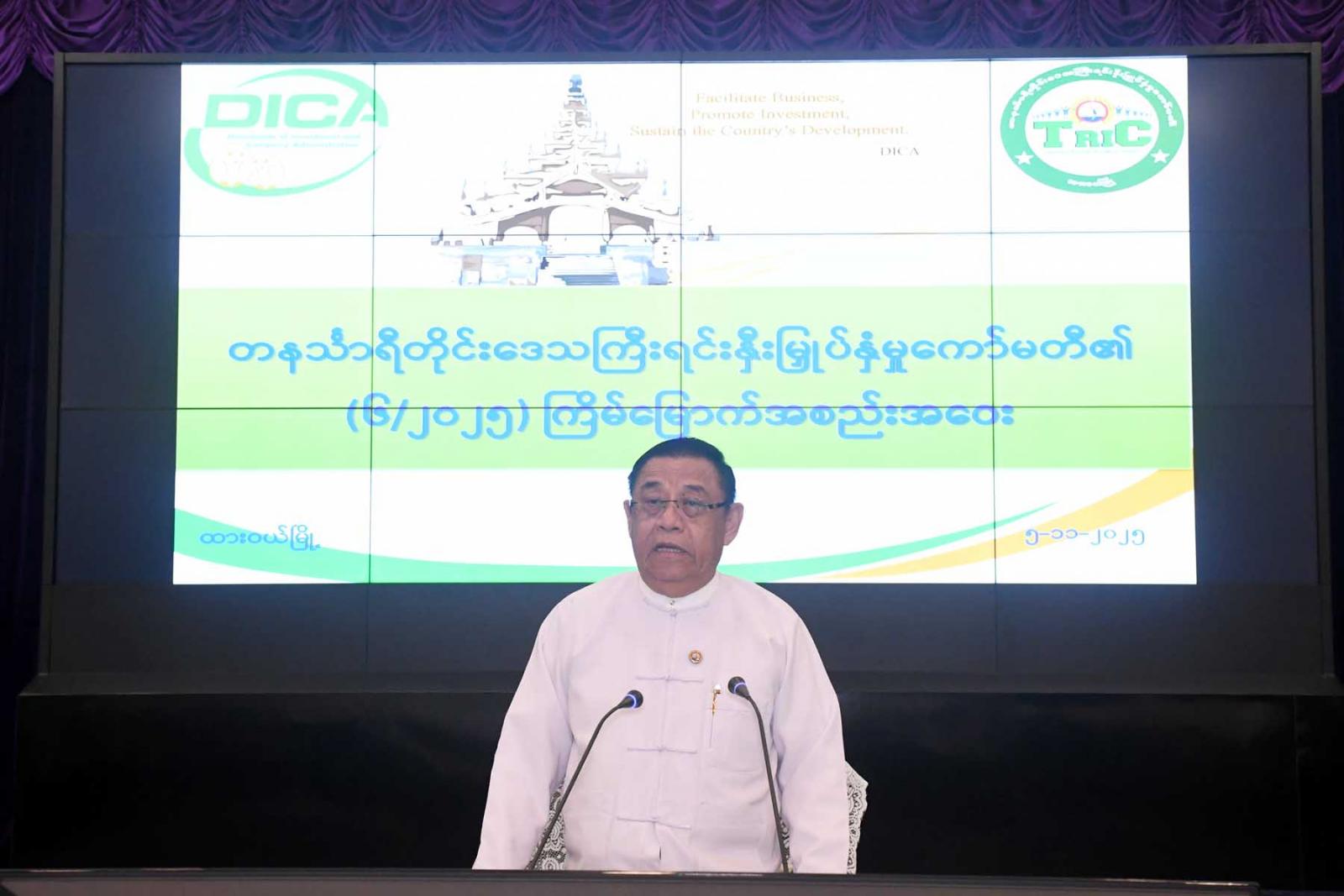 ထို့နောက်ရာခိုင်နှုန်းပြည့်မြန်မာနိုင်ငံသားရင်းနှီးမြှုပ်နှံမှုဖြင့် AWBA SAN Co., Ltd. က ပထော်ကြေး တိုင်ပြင်ကွင်း၊ မအိုင်ကျေးရွာအုပ်စု၊ ကျွန်းစုမြို့နယ်ရှိ ဥယျာဉ်ခြံမြေဧရိယာ (၉၈) ဧကတွင်ခေတ်မီရေငန် ပုစွန်မွေးမြူ ထုတ်လုပ် ရောင်းချခြင်းလုပ်ငန်းအားလည်းကောင်း၊ Nay La Yaung (Dawei) Co., Ltd. က သဗျာအေကွင်း၊ သဗျာကျေးရွာအုပ်စု၊ ထားဝယ်မြို့နယ်ရှိ ဥယျာဉ်ခြံမြေဧရိယာ (၂.၄၄) ဧကတွင် ဝဥအလွှာ အခြောက်ခံ လုပ်ငန်းအားလည်းကောင်းရှင်းလင်းတင်ပြရာ တိုင်းဒေသကြီးရင်းနှီးမြှုပ်နှံမှု ကော်မတီဝင်များ က ဖြည့်စွက်ဆွေးနွေးပြီး တိုင်းဒေသကြီးဝန်ကြီးချုပ်က ညှိနှိုင်းဆောင်ရွက်ပေးသည်။