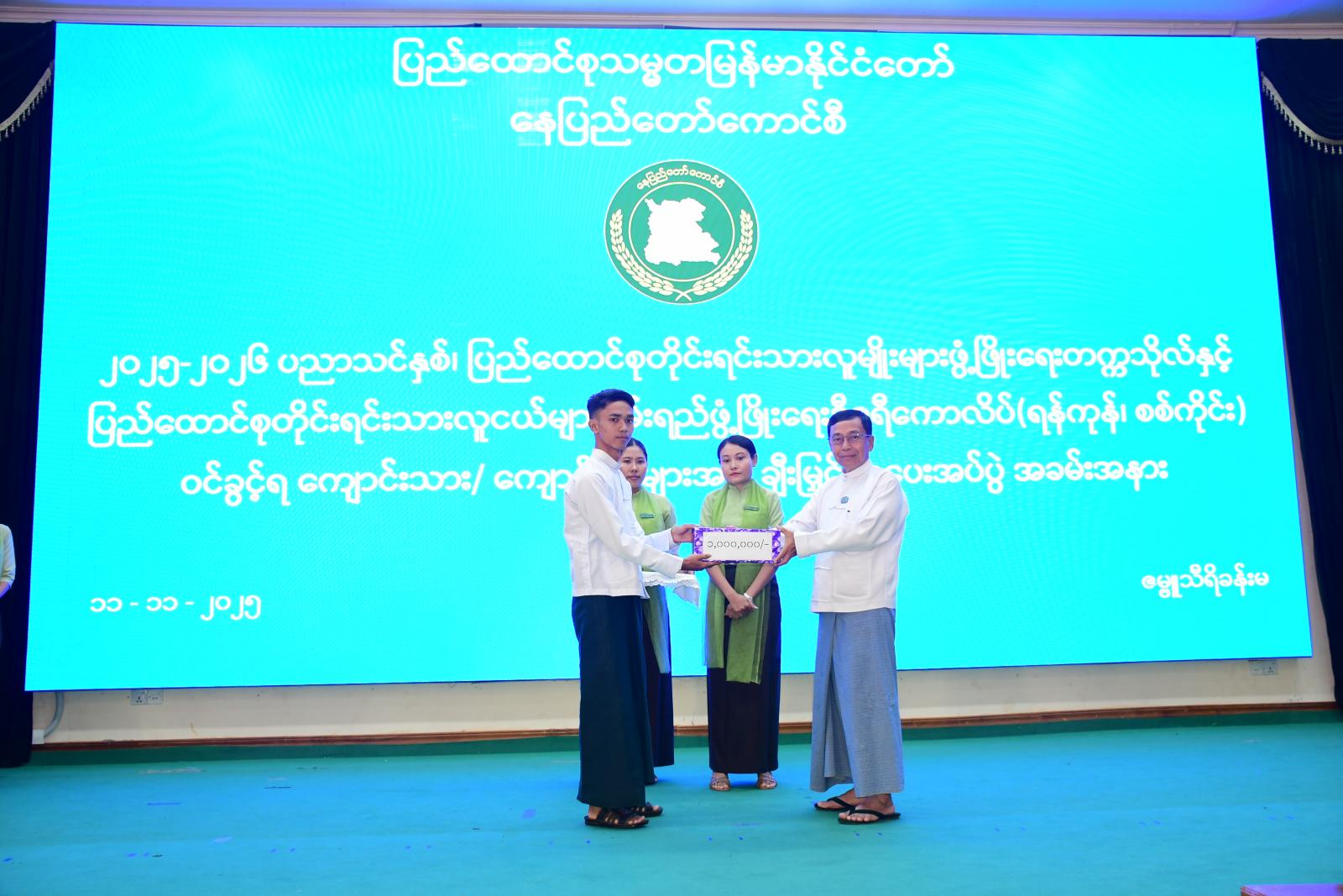 ထို့နောက် နေပြည်တော်ကောင်စီဥက္ကဋ္ဌက ဝင်ခွင့်ရ ကျောင်းသူ၊ ကျောင်းသား စုစုပေါင်း ၁၄ ဦး အတွက် ချီးမြှင့်ငွေများကိုပေးအပ်ရာ ဝင်ခွင့်ရကျောင်းသား၊ ကျောင်းသူများက လက်ခံရယူပြီး ကျောင်းသားတစ်ဦးမှ ကျေးဇူးတင်စကားပြန်လည်ပြောကြားခဲ့ကြောင်း သိရသည်။