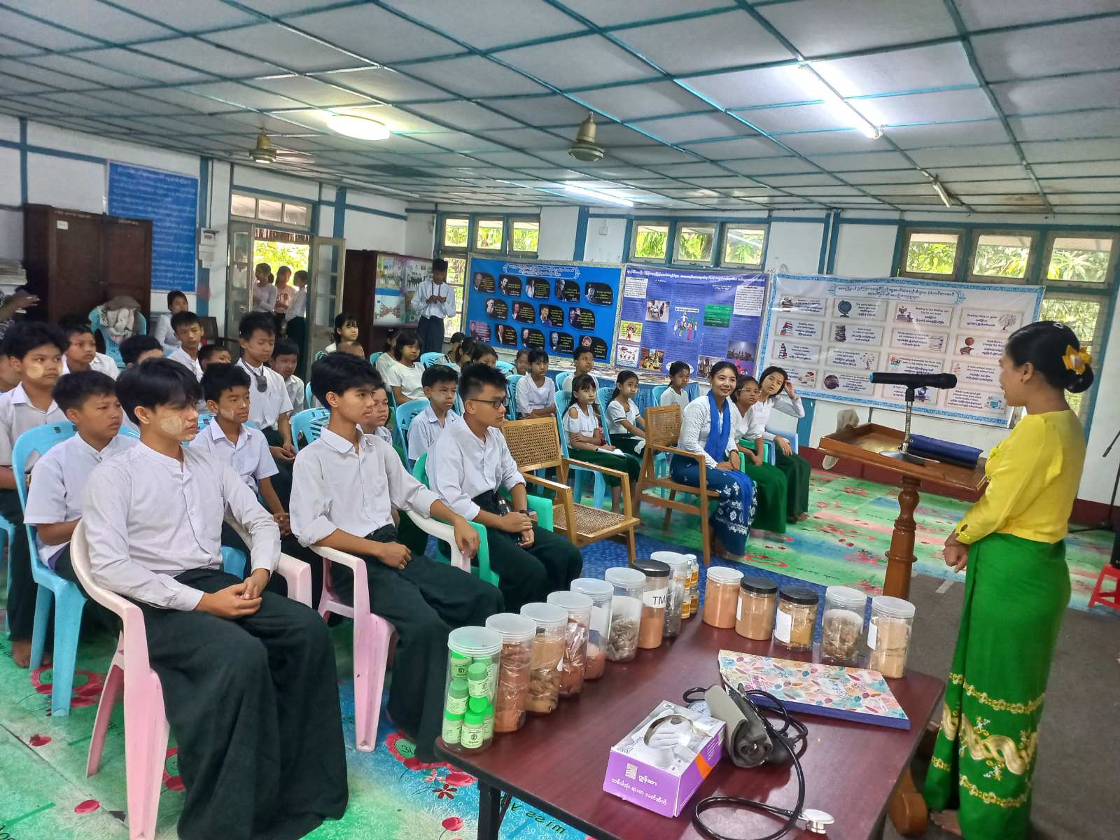 ဟောပြောပွဲတွင် ပြန်ကြားရေးနှင့်ပြည်သူ့ဆက်ဆံရေးဦးစီးဌာန မြို့နယ်ဦးစီးမှူး ဒေါ်အိအိမွန်က ဟောပြောပွဲကျင်းပရခြင်း၏ ရည်ရွယ်ချက်များ ၊ လူငယ်နှင့်ခေါင်းဆောင်မှု ခေါင်းစဉ်များဖြင့်ဟောပြောခဲ့ပြီး မြို့နယ်တိုင်းရင်းဆေးကုဌာနမှ ဒု-တိုင်းရင်းဆေးမှုး ဒေါ်စန္ဒာအေးက အိမ်သုံးတိုင်းရင်းဆေး၀ါးများအကြောင်းအသိပညာပေးဟောပြောခဲ့ပြီး မြို့နယ်တိုင်းရင်းဆေးကုဌာနမှ ဒု-တိုင်းရင်းဆေးမှုး ဒေါ်စန္ဒာအေး ဦးဆောင်သော ကွင်းဆင်းဆေးကုသရေးအဖွဲ့သည် အမှတ် (၄) အေခြခံပညာမူလတန်းကျောင်းမှ ကျောင်းသား/သူ (၃၇)ဦးအား ကျန်းမာရေးစောင့်ရှောက်မှုများ ပေးခဲ့သည်။