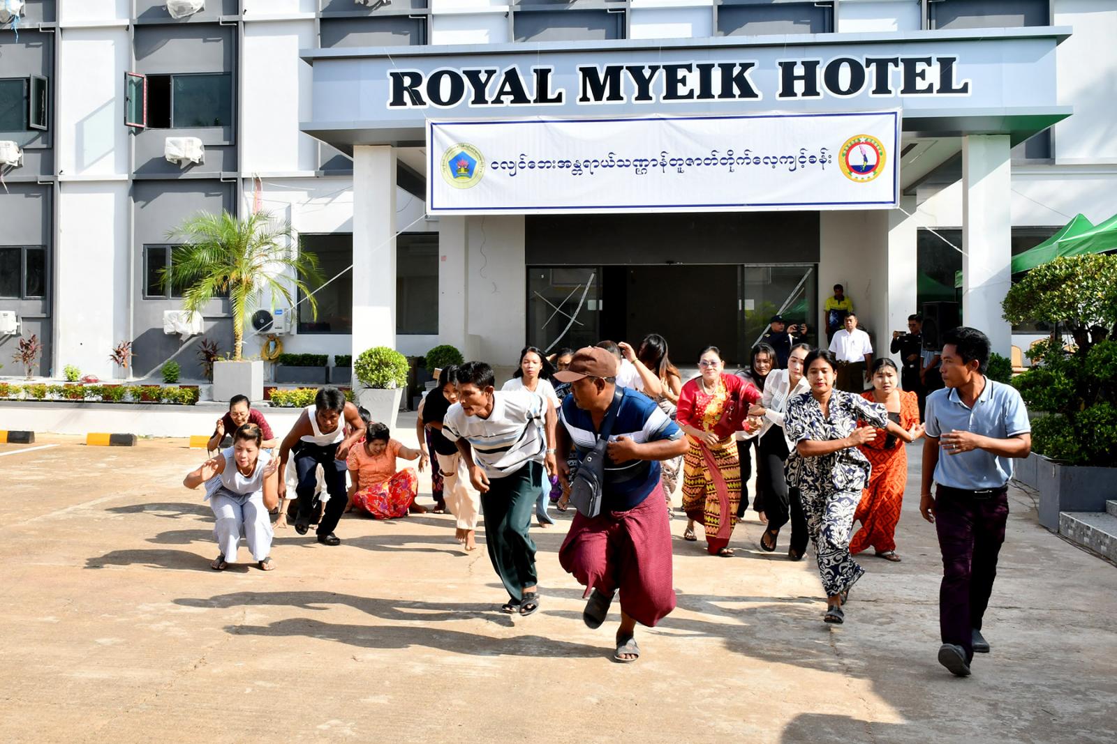 တနင်္သာရီတိုင်းဒေသကြီးဝန်ကြီးချုပ် ဦးမြတ်ကိုသည် တိုင်းဒေသကြီးတရားလွှတ်တော်တရားသူကြီးချုပ်၊ တိုင်းဒေသကြီးဝန်ကြီးများ၊ ဌာနဆိုင်ရာတာဝန်ရှိသူများနှင့်အတူ ယမန်နေ့ နံနက်ပိုင်းက တိုင်းဒေသကြီးအစိုးရအဖွဲ့၏ဦးဆောင်မှုဖြင့် ဟိုတယ်၊ မိုတယ်နှင့် တည်းခိုခန်းများတွင် သဘာဝဘေးအန္တရာယ်များ ဖြစ်ပွားလာပါက ရှာဖွေကယ်ဆယ်ရေးလုပ်ငန်းများ အလျင်အမြန် တုံ့ပြန်ဆောင်ရွက်နိုင်ရန်အတွက် မြိတ်မြို့ Royal Hotel တွင်ပြုလုပ်သည့်ငလျင်ဘေးအန္တရာယ် သဏ္ဌာန်တူဇာတ်တိုက်လေ့ကျင့်ခြင်းကို တက်ရောက်ကြည့်ရှုအားပေးကြကြောင်း သိရသည်။