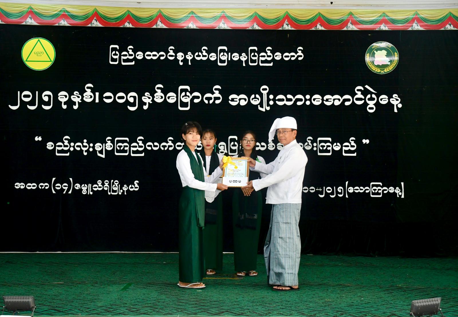 ထို့နောက် နေပြည်တော်ကောင်စီဥက္ကဋ္ဌ ဦးသန်းထွန်းဦးက (၁၀၅)နှစ်မြောက် အမျိုးသား အောင်ပွဲနေ့ အထိမ်းအမှတ် အခြေခံပညာအထက်တန်းအဆင့် စာစီစာကုံးပြိုင်ပွဲတွင် ဆုရရှိကြသည့် ကျောင်းသား၊ ကျောင်းသူများအားလည်းကောင်း၊ နေပြည်တော်ကောင်စီဝင် ဦးမြင့်စိုးက အလယ်တန်းအဆင့် ကဗျာပြိုင်ပွဲတွင် ဆုရရှိကြသည့် ကျောင်းသား၊ ကျောင်းသူများအား လည်းကောင်း ဂုဏ်ပြုဆုများ အသီးသီးပေးအပ်ချီးမြှင့်ကြသည်။