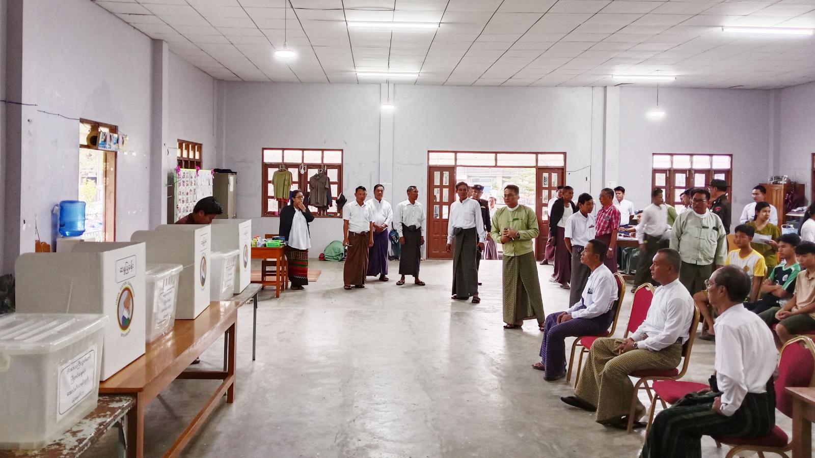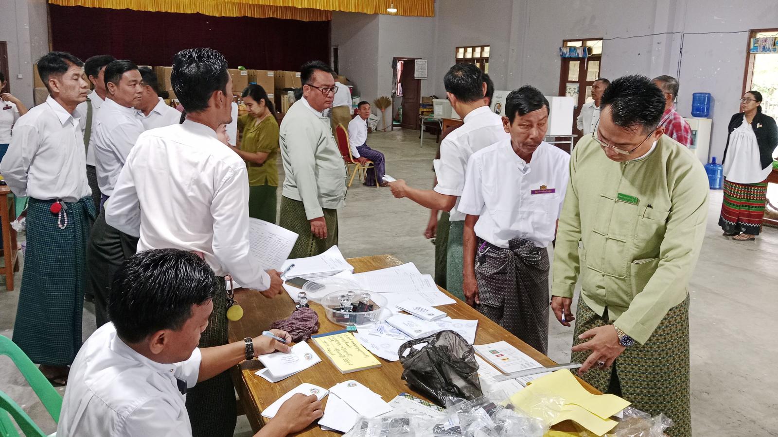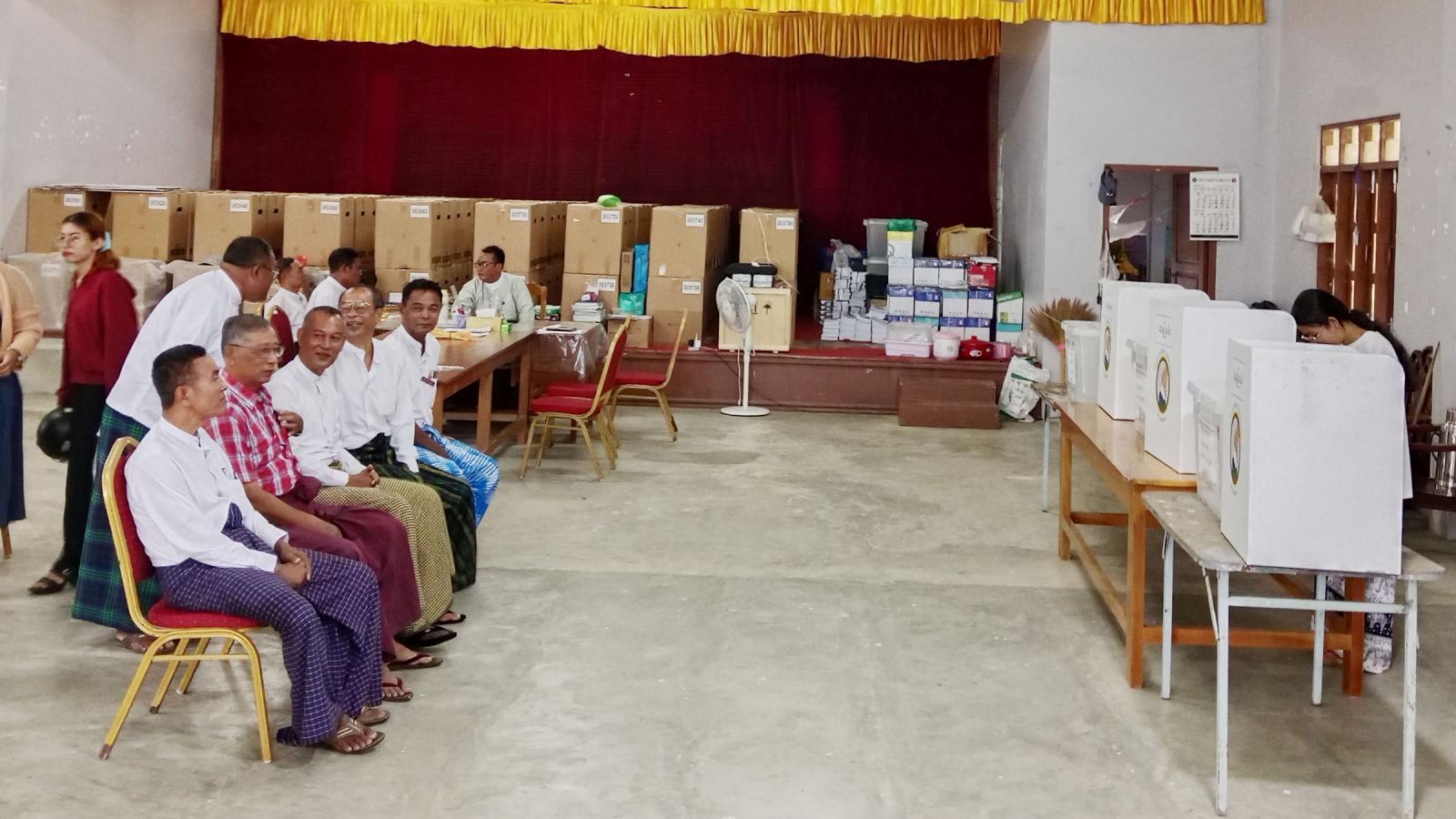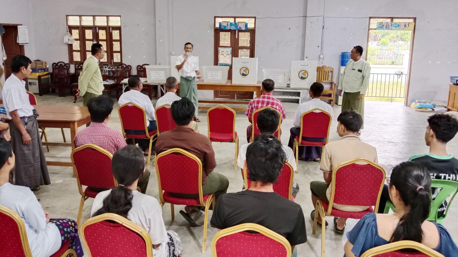 ကျောင်းသား၊ ကျောင်းသူများ ကြိုတင်ဆန္ဒမဲပေးနေမှုကို မြို့နယ်ရွေးကောက်ပွဲကော်မရှင်အဖွဲ့ခွဲဥက္ကဋ္ဌနှင့် အဖွဲ့ဝင်များ၊ ဘုတ်ပြင်းခရိုင်စီမံခန့်ခွဲရေးနှင့် အုပ်ချုပ်ရေးကော်မတီဥက္ကဋ္ဌနှင့် အဖွဲ့ဝင်များ၊ မြို့နယ်စီမံခန့်ခွဲရေးနှင့်အုပ်ချုပ်ရေးကော်မတီဥက္ကဋ္ဌနှင့် အဖွဲ့ဝင်များနှင့် တာဝန်ရှိသူများက ကြည့်ရှုအားပေးကြသည်။