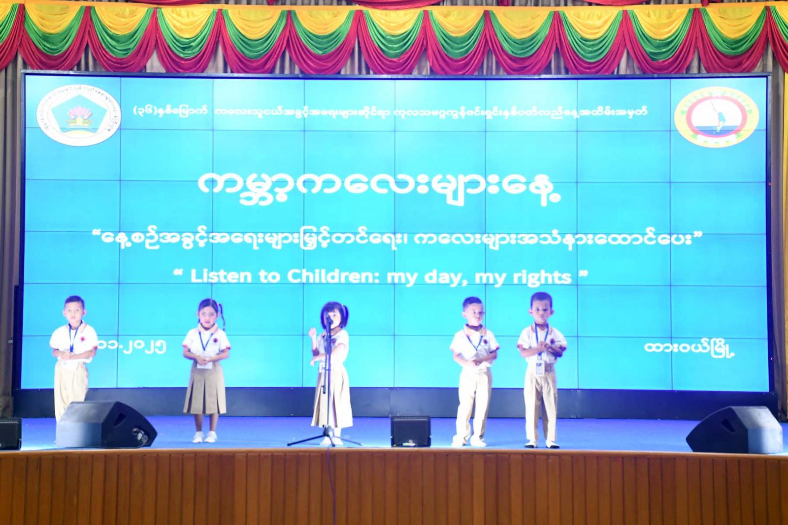 ထို့နောက် ကလေးသူငယ်အခွင့်အရေးများဆိုင်ရာ ကုလသမဂ္ဂကွန်ဗင်းရှင်း နှစ်ပတ်လည်နေ့အထိမ်းအမှတ် Video Clip နှင့် ၊မူလတန်းကြိုကျောင်းမှသားငယ်သမီးငယ်များ၏ တေးသီချင်းများ၊ ပုံပြင်များ၊ ကဗျာများ၊ သရုပ်ဖော်ပုံပြင်များ၊ အကအလှများ သီဆိုကပြဖျော်ဖြေနေမှုများကို တိုင်းဒေသကြီးဝန်ကြီးချုပ်နှင့် တိုင်းဒေကြီးဝန်ကြီးများက ကြည့်ရှုအားပေး ပြီး အမှတ်တရလက်ဆောင်များ ပေးအပ်ခဲ့ကြောင်း သတင်းရရှိသည်။