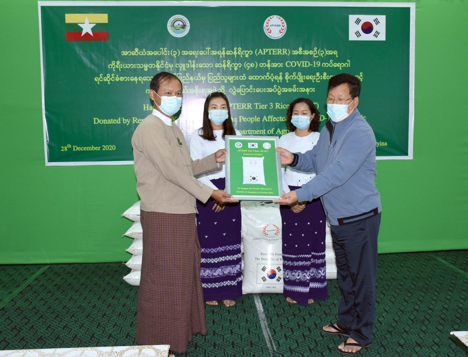 ကချင်ပြည်နယ်အတွင်း ကိုဗစ်-၁၉ကပ်ရောဂါ ရင်ဆိုင်ခံစားနေရသော ပြည်သူများနှင့် ၎င်းတို့၏ မိသားစုများအတွက် အာဆီယံအပေါင်း(၃) အရေးပေါ်ဆန်ရိက္ခာ (APTERR) အစီအစဉ်အရ ကိုရီးယားသမ္မတ နိုင်ငံမှလှူဒါန်းသော ဆန်ရိက္ခာ (၄၈)တန်အား ပြည်နယ်စိုက်ပျိုးရေး ဦးစီးဌာနမှတစ်ဆင့် ပြည်နယ်အစိုးရ အဖွဲ့ထံသို့ လွှဲပြောင်းပေးအပ်ခြင်းကို ယမန်နေ့ မွန်းလွှဲ ၁ နာရီခွဲတွင် ပြည်နယ်စိုက်ပျိုးရေး ဦးစီးဌာနရုံး၊ အစည်းအဝေး ခန်းမ၌ ပြုလုပ်ခဲ့သည်။