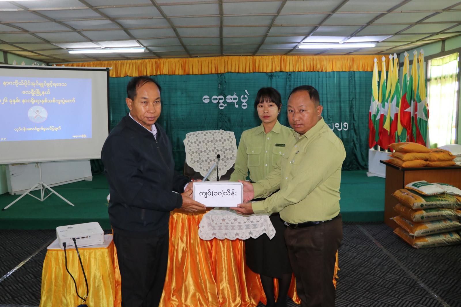ဆက်လက်ပြီး တိုင်းဒေသကြီးဝန်ကြီးချုပ်နှင့် တိုင်းဒေသကြီး အစိုးရအဖွဲ့အတွင်းရေးမှူးတို့က မြို့နယ်ဌာနဆိုင်ရာဝန်ထမ်းများ လုံခြုံရေးတာဝန်ထမ်းဆောင်နေကြသည့် တပ်ဖွဲ့ဝင်များနှင့် နာဂရိုးရာစာပေနှင့်ယဉ်ကျေးမှုအဖွဲ့များထံ ငွေကျပ် ၁၀ သိန်းစီတို့အား အသီးသီးပေးအပ်ခဲ့ကြပြီး တိုင်းဒေသကြီးအဆင့် ဌာနဆိုင်ရာများက ဒေသခံတောင်သူများထံ မိုးစပါးဆင်းဧကရီ(၃)၊ အောင်နိုင်တိုးမျိုးစပါးများ၊ အစေ့ထုတ်ပြောင်းမျိုးစေ့များ၊ နေကြာရေဆင်းစပ်မျိုး(၁)နှင့် ဆေးဖျန်းပုံးများအား ပေးအပ်ခဲ့ကြသည်။