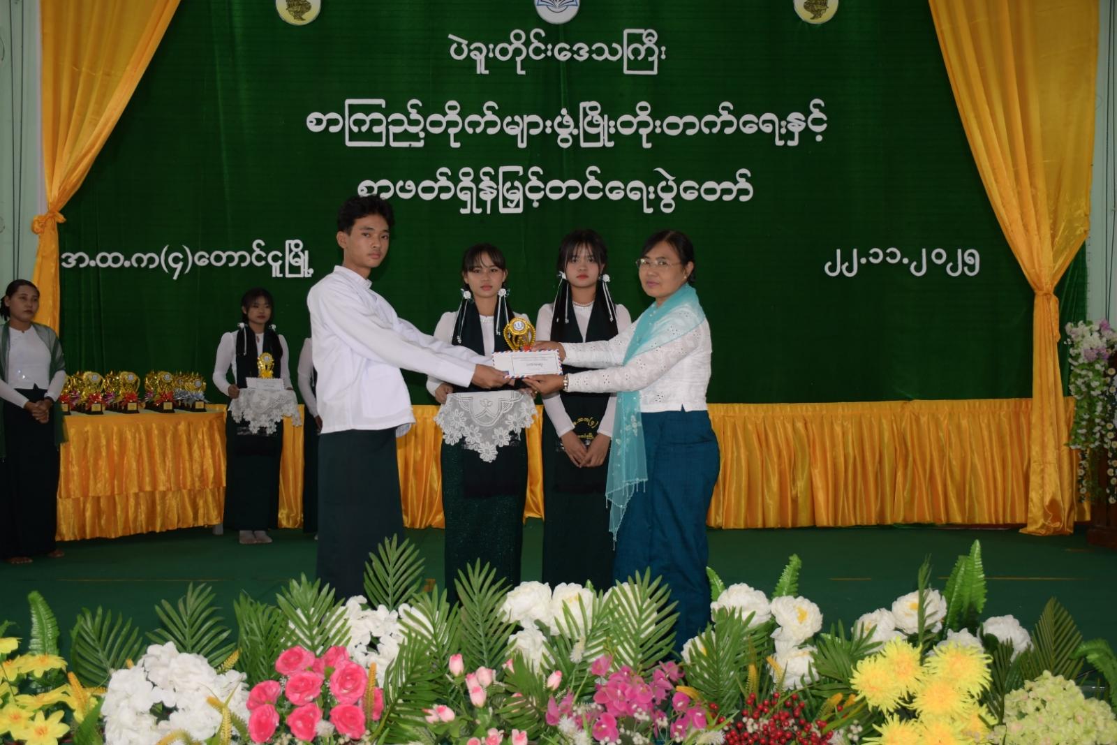 ဆက်လက်၍ မွန်းလွဲပိုင်းတွင် ဆုချီးမြှင့်ခြင်းအခမ်းအနားကို ကျင်းပရာ အထက (၄)မှ ကျောင်းသားကျောင်းသူများက ဇာတိမာန်သီချင်းဖြင့် သီဆိုဖွင့်လှစ်ပြီး ပဲခူးတိုင်းဒေသကြီးပြန်ကြားရေးနှင့်ပြည်သူ့ဆက်ဆံရေးဦးစီးဌာနမှ ညွှန်ကြားရေးမှူး ဒေါ်ကြင်ကြင်သန်းနှင့် ဒုတိယညွှန်ကြားရေးမှူး ဒေါ်ရီရီလွင်၊ ခရိုင်ပညာရေးမှူး ဒေါက်တာ နော်ဥမ္မာထွန်း၊ တောင်ငူခရိုင်ပြန်ကြားရေးနှင့်ပြည်သူ့ဆက်ဆံရေးဦးစီးဌာနမှ လက်ထောက်ညွှန်ကြားရေးမှူး ဒေါ်ဆွေဆွေမိုးနှင့် တာဝန်ရှိသူများက စာစီစာကုံးပြိုင်ပွဲ၊ ကျပန်းစကားပြောပြိုင်ပွဲ၊ စာဖတ်စွမ်းရည်ပြိုင်ပွဲ၊ ပန်းချီပြိုင်ပွဲ၊ ပုံပြင်ပြောပြိုင်ပွဲနှင့် ကဗျာရွတ်ပြိုင်ပွဲများတွင် ပထမဆု၊ ဒုတိယဆု၊ တတိယဆု၊ နှစ်သိမ့်ဆု (၁)၊ နှစ်သိမ့်ဆု (၂)ဆုများရရှိသည့် ကျောင်းသားကျောင်းသူများအား ဆုများအသီးသီးပေးအပ်ချီးမြှင့်ခဲ့ကြောင်း သိရသည်။