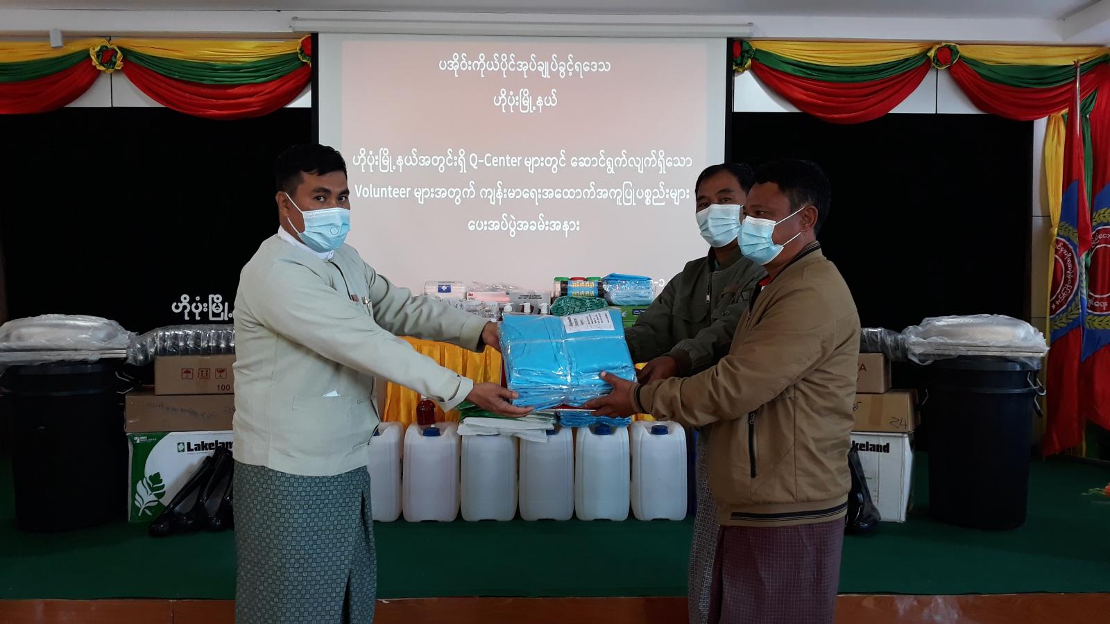 ရှေးဦးစွာ မြို့နယ်အထွေထွေအုပ်ချုပ်ရေးဦးစီးဌာန မြို့နယ်အုပ်ချုပ်ရေးမှူး ဦးနန်းတင့်က အဖွင့်အမှာစကား ပြောကြားပြီး မြို့နယ် အုပ်ချုပ်ရေးမှူး ဦးနန်းတင့်က Quarantine Center (၆)ခု အတွက် Volunteer များကို N-95 Mask (၆၀)ခု၊ Hand Gel (၄၉)ဗူး၊ Face Shield (၁၀၁၄)ခု၊ Surgical Cap (၂၄၆)ခု၊ Googles မျက်မှန်(၂၅၂)ခု၊ အမှိုက်အိတ် (၄၈၀)ခု၊ အိမ်သာဆေးရည်(၄၈) ပုလင်း၊ အရက်ပြန်(၁၅၀)ပုလင်း၊ ထီးအကြီး(၁၂)ခု၊ Disposable Table Sheet (၂၅၂)ခု၊ Hand Speaker (၆)ခု၊ PPE (၂၄၆)စုံ၊ Apron ရှေ့ဖုံးခါးစည်း(၂၅၂)ခု၊ Surgical Gown (၆၀)ခု၊ သူနာပြုဆေးပုံး(၆)ခု၊ အပူချိန်တိုင်းစက်(၆)ခု၊ Hand Washing Soap Liguid (၂၅၂)ဗူး၊ ဗီတာမင်စီ (၃၇၁၄)လုံး၊ အန်နာဗွန်စီ (၃၇၁၄)လုံး၊ Bleashing Powder (၆၀)စည်၊ surgical Mask (၁၀၅၀)ခု၊ Glove တစ်ခါသုံး(၄၉၂)စုံ၊ ရော်ဘာ Glove (၂၄၆)စုံ၊ Examination Glove (၉၀)စုံ၊ လည်ရှည် ဖိနပ်(၇၂)ရံ၊ ပိုးသတ်ဆေးရည်(၁၂၆)ဂါလန်၊ ဆေးဖြန်းပုံး(၁၈)ပုံး၊ ဘေစင်(၆)ခု၊ အမှိုက်ပုံးကြီး(၆)ပုံး၊ အကြမ်းစီး ဖိနပ်(၃၆)ရံ၊ Hand Spray (၃၀၆)ဗူး၊ ဖိနပ်စွပ်(၁၀၂)စုံ၊ ပိုးသတ်ဆေးဖြန်းစက်(၆)ခုတို့ကို အသီးသီးပေးအပ်ခဲ့ကြောင်း သိရသည်။