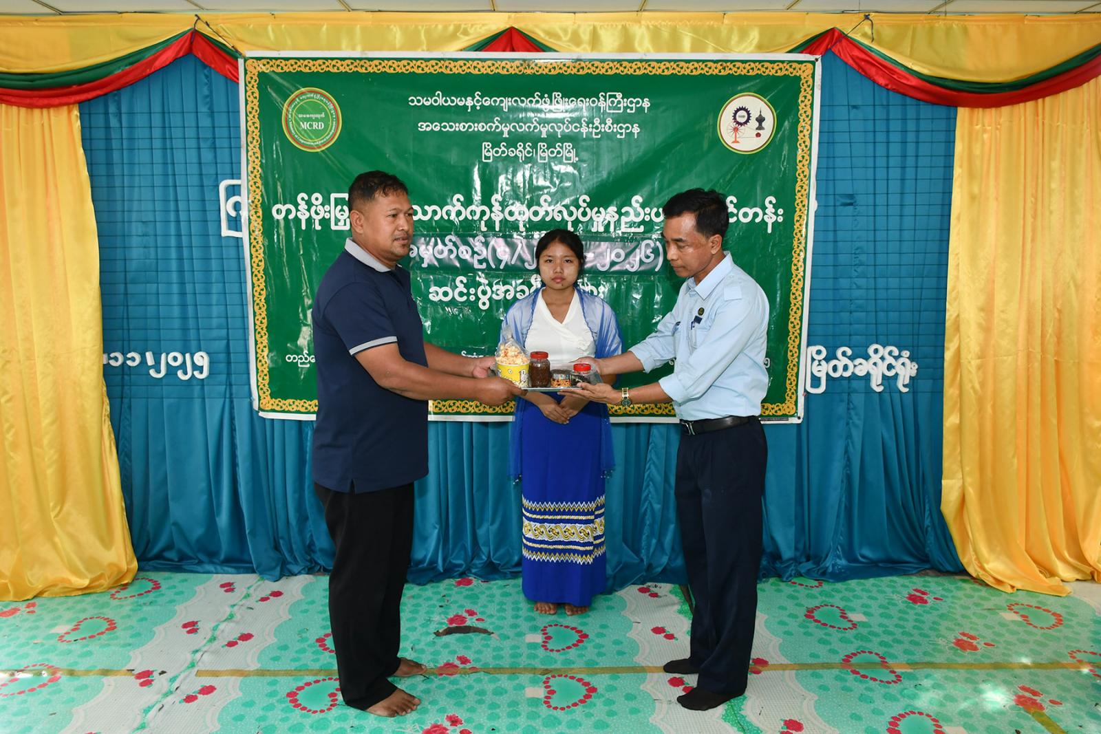 သင်တန်းဆင်းပွဲတွင် အသေးစားစက်မှုလက်မှုလုပ်ငန်းဦးစီးဌာန မြိတ်ခရိုင်ဦးစီးမှူး ဒေါ်သူသူစံက သင်တန်းဆင်းအမှာစကားပြောကြားပြီး ပြန်ကြားရေးနှင့်ပြည်သူဆက်ဆံရေးဦးစီးဌာန မြိတ်ခရိုင်ဦးစီးမှူး ဒေါ်ဝါဝါခိုင်က သင်တန်းဆင်းလက်မှတ်နှင့် စားသုံးသူရေးရာဦးစီးဌာန မြိတ်ခရိုင်ဦးစီးမှူး ဦးမျိုးဝင်းက သင်တန်းထုတ်ကုန်ပစ္စည်းများကို သင်တန်းသားများအား ပေးအပ်ကြသည်။