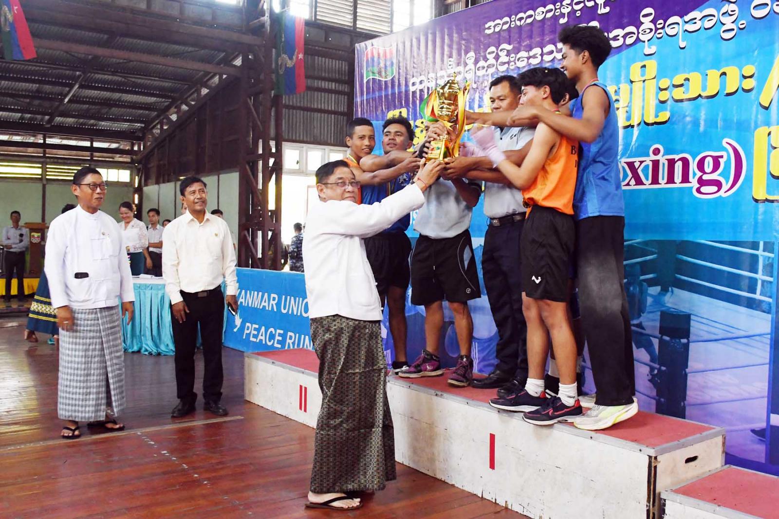 ဦးစွာ ဗိုလ်လုပွဲသို့တက်ရောက်လာသည့် အမျိုးသား/အမျိုးသမီးများ၏ ကီလိုတန်းအလိုက် အကြိတ်အနယ် လက်ဝှေ့ယှဉ်ပြိုင်ကစားနေမှုကို တိုင်းဒေသကြီးဝန်ကြီးချုပ်နှင့်တာဝန်ရှိသူများ၊ အားကစားသမားများနှင့် အားကစားဝါသနာရှင်များက ကြည့်ရှုအားပေးကြသည်။