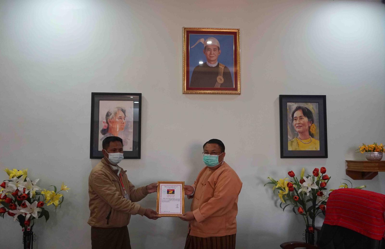 လွိုင်ကော်မြို့နယ် ပညာရေးကောလိပ်တွင် ဖွင့်လှစ်ထားရှိသော Community Based Facility Quarantine Center တွင် အသုံးပြုလျက်ရှိသည့် လျှပ်စစ်မော်တာပန့်များ ပြုပြင်ဆောင်ရွက်နိုင်ရန် အတွက် ယမန်နေ့ မွန်းလွဲပိုင်းက ကယားပြည်နယ်အစိုးရအဖွဲ့ရုံး၊ ဝန်ကြီးချုပ်ရုံးခန်း၌ လျှံထူးအောင် ကုမ္ပဏီမှ ငွေကျပ်(၁၀)သိန်းအား လာရောက်လှူဒါန်းရာ ကယားပြည်နယ် ခေတ္တဝန်ကြီးချုပ် ဦးဘောစ့်ကိုက ဂုဏ်ပြု မှတ်တမ်း လွှာ ပြန်လည်ပေးအပ်ခဲ့ကြောင်း သိရသည်။
