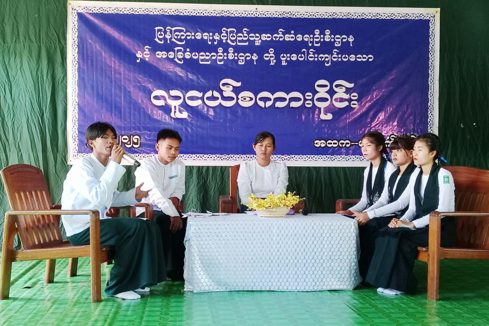 စကားဝိုင်းတွင် အထက-အောက်လိပ်ကျောင်းအုပ်ဆရာမကြီး ဒေါ်ခင်မင်းဝါက လူငယ်စကားဝိုင်း ဆွေးနွေးပွဲနှင့် ပတ်သက်၍ အဖွင့်အမှာစကားပြောကြားသည်။