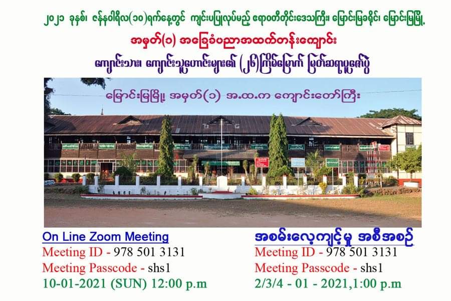 မြောင်းမြမြို့အထက(၁)မြတ်ဆရာပူဇော်ပွဲသို့Online တတ်ရောက်လိုသူများသည်Zoom Meeting ID Code. 978 501 3131 , Pass Code - shs 1 သို့ချိတ်ဆက်ဝင်ရောက်နိုင်ကြောင်း သိရသည်။