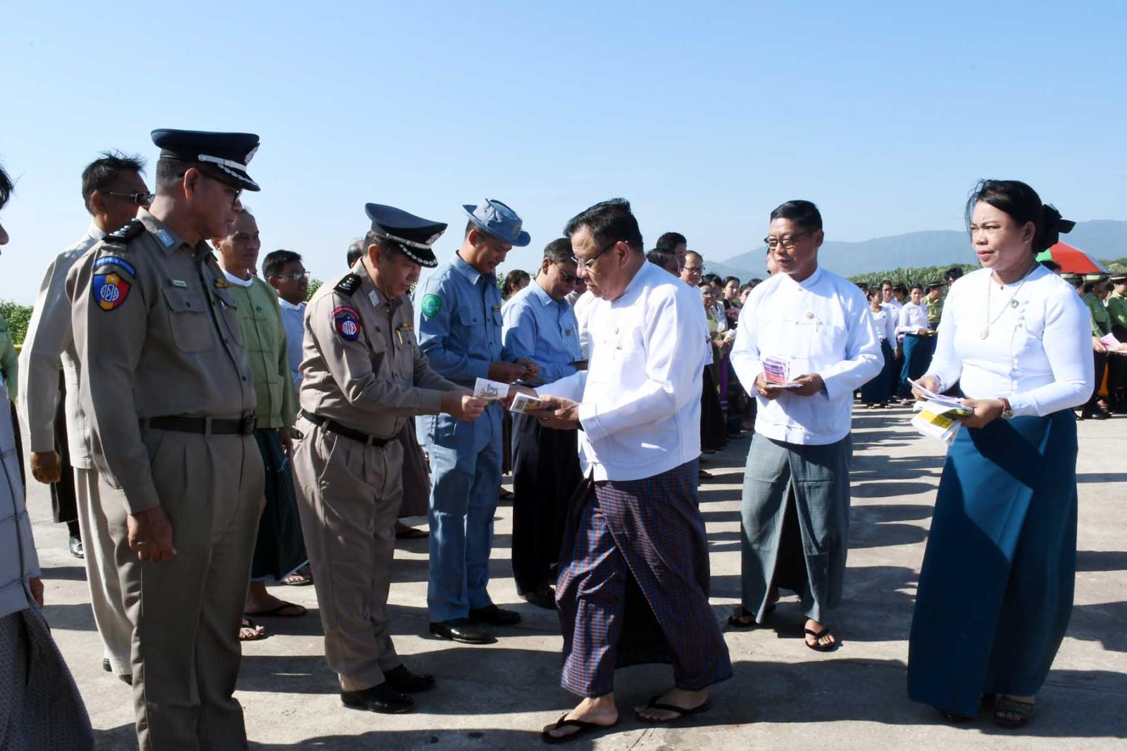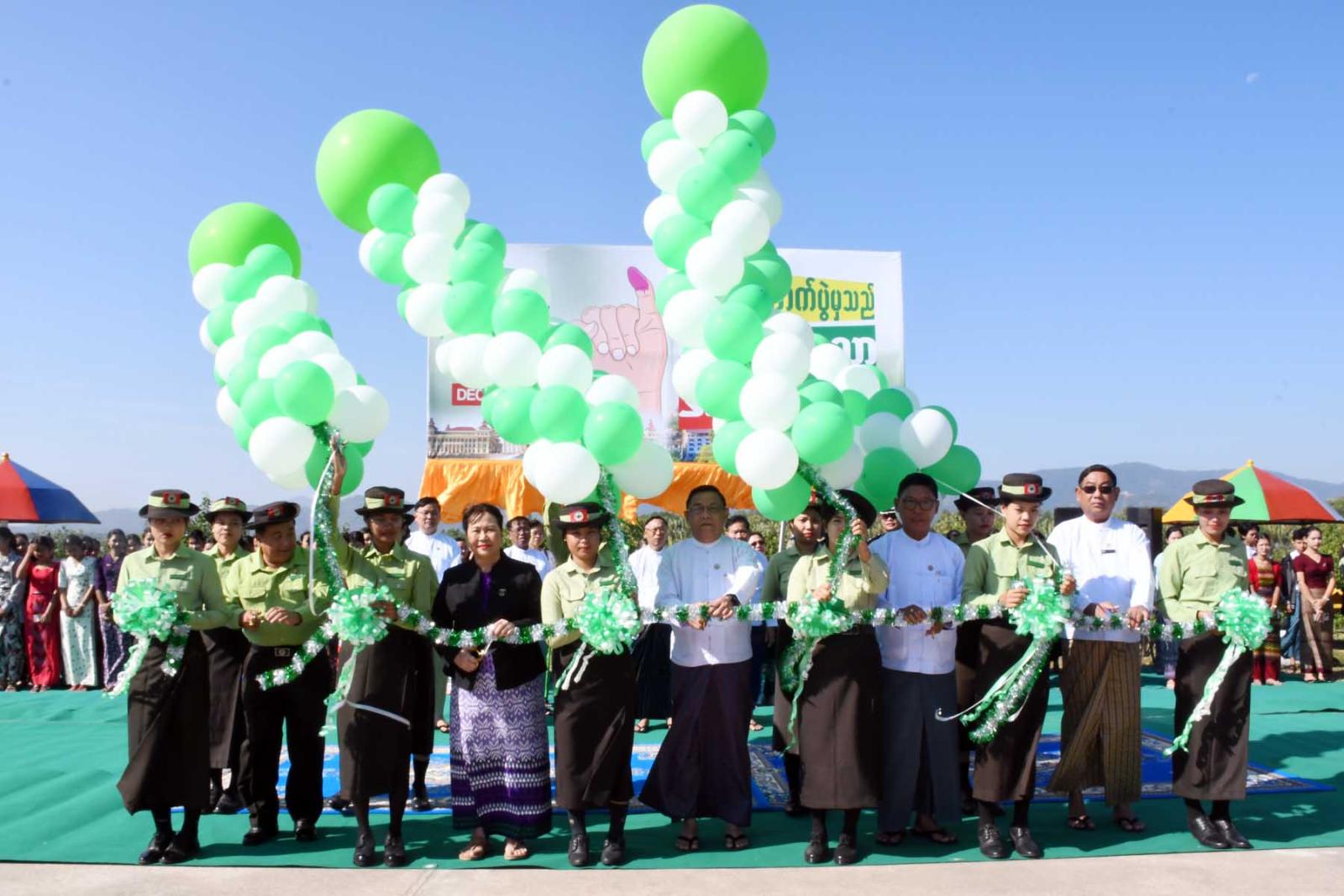 ဦးစွာတိုင်းဒေသကြီးဝန်ကြီးချုပ် ဦးမြတ်ကို၊ တိုင်းဒေသကြီးတရားလွှတ်တော်တရားသူကြီးချုပ် ဒေါ်ပိုက်ပိုက်အေး၊ တိုင်းဒေသကြီးလူမှုရေးရာဝန်ကြီးဦးသက်နိုင်၊ တိုင်းဒေသကြီးအတွင်းရေးမှူး ဦးအောင်ချို၊ တိုင်းဒေသကြီးလွှတ်တော်ရုံး ဒုတိယညွှန်ကြားရေးမှူးချုပ်ဦးမြင့်ဝေတို့က “ ဒို့အတူတူ မဲပေးကြမယ်” မြေစိုက်ပိုစတာကို ဖဲကြိုးဖြတ်ဖွင့်လှစ်ပေးပြီး တိုင်းဒေသကြီးဝန်ကြီးချုပ်က ဘင်ခရာအဖွဲ့နှင့် ပန်းပွားအဖွဲ့အား ဂုဏ်ပြုဆုငွေများ ချီးမြှင့်သည်။