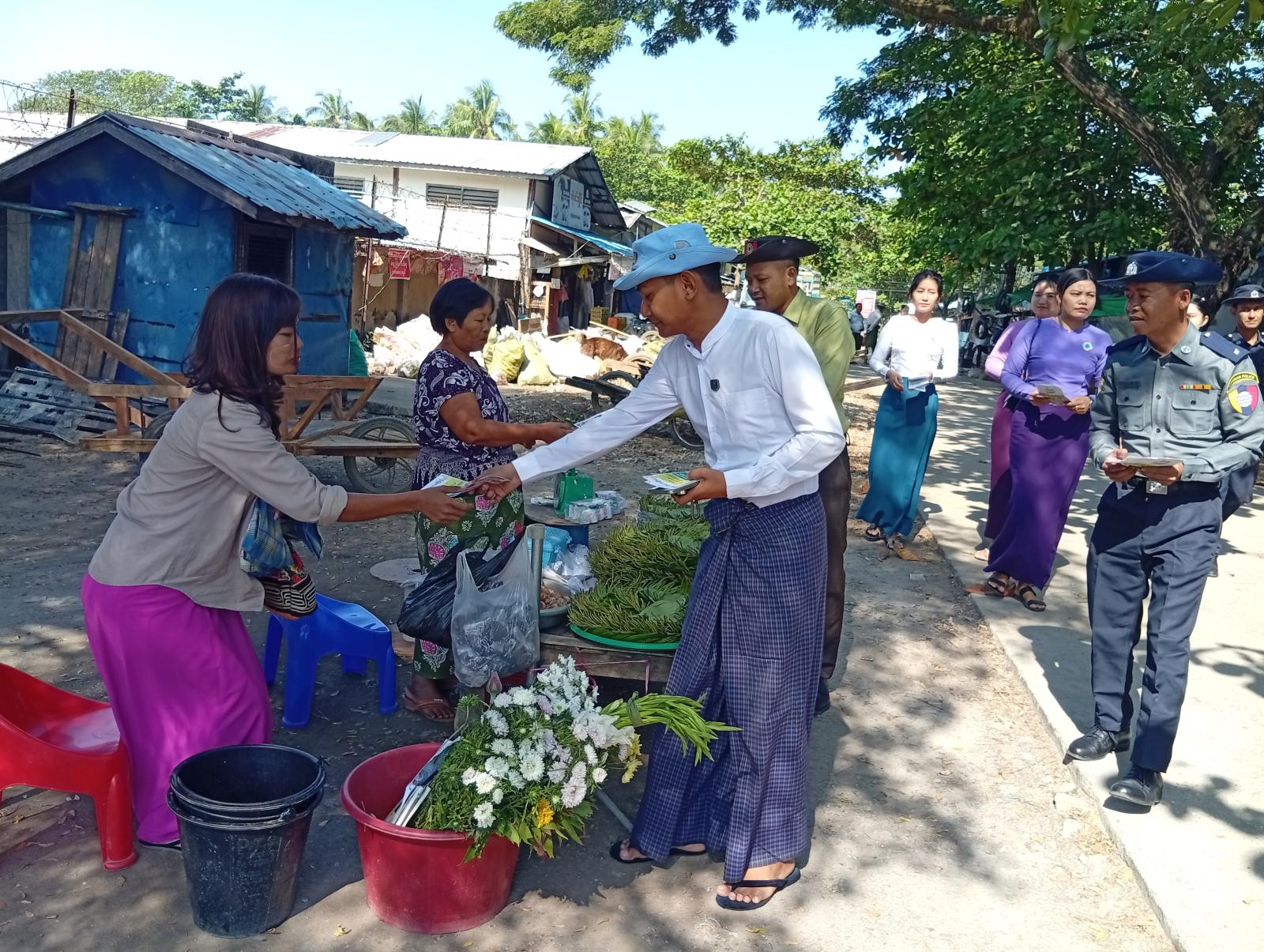 ထိုသို့ဆောင်ရွက်ရာတွင် ချောင်းသာမြို့အထွေထွေအုပ်ချုပ်ရေးဦးစီးဌာန ဝန်ထမ်းများ၊ ရဲတပ်ဖွဲ့ဝင်များ၊ မီးသတ်တပ်ဖွဲ့ဝင်များ၊ ပြန်ကြားရေးနှင့်ပြည်သူ့ဆက်ဆံရေးဦးစီးဌာန ဝန်ထမ်းများ၊ ဌာနဆိုင်ရာဝန်ထမ်းများနှင့် အမျိုးသမီးရေးရာအဖွဲ့ဝင်များစုပေါင်းကာ ရွေးကောက်ပွဲဆိုင်ရာအသိပညာပေး လှုံ့ဆော်မှုအဖြစ် “ဒို့အတူတူမဲပေးကြမယ်” လက်ကမ်းစာစောင်များကို ချောင်းသာမြို့ရှိ လူစည်ကားရာ နေရာများဖြစ်သော ကားဂိတ်၊ မြို့မဈေးနှင့် ချောင်းသာကမ်းခြေတို့တွင် အသိပညာပေးဖြန့်ဝေပေးခဲ့ကြသည်။