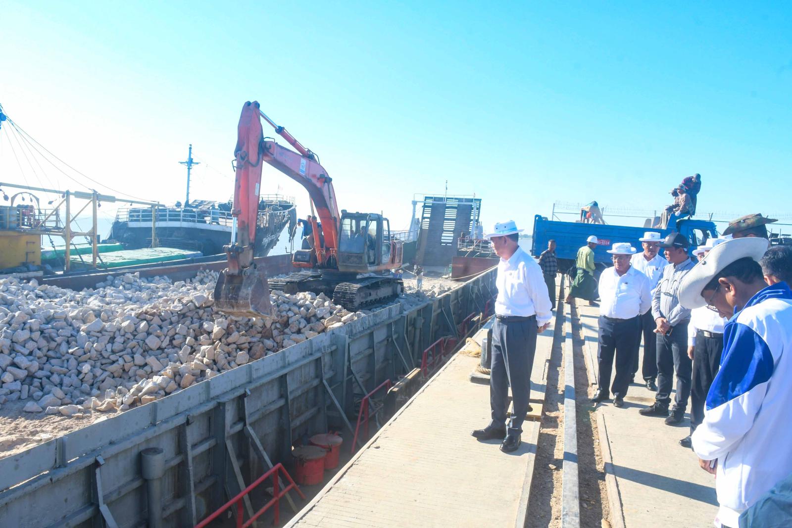 ဦးစွာ ပြည်နယ်ဝန်ကြီးချုပ်နှင့်အဖွဲ့သည် အမ်ဗွီမြန်မာ့အလှသင်္ဘောပေါ်မှ တည်ဆောက်ရေးသုံးပစ္စည်းများအား လူအင်အား၊ စက်ယန္တရားအင်အားများအသုံးပြု၍ ကုန်တင်ကုန်ချပြုလုပ်နေမှုကို သွားရောက်ကြည့်ရှု စစ်ဆေးကြသည်။