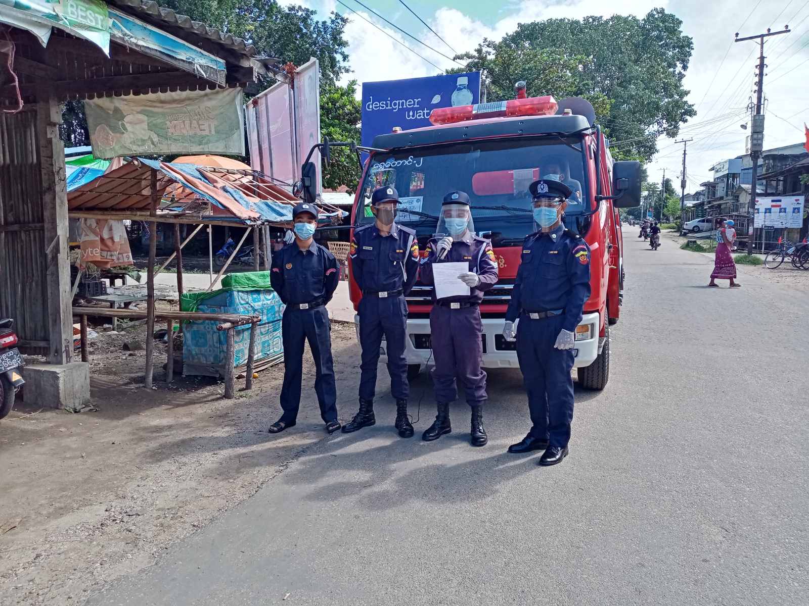 ထိုသို့ဆောင်ရွက်ရာတွင် လူစည်ကားရာနေရာများဖြစ်သည့် စျေးများ၊ ရပ်ကွက်များ၊ ကျေးရွာ ပြည်သူ များအား ကိုဗစ်-၁၉ ရောဂါကူးစက်ခံရပါက ဖြစ်ပွားတက်သော ရောဂါ လက္ခဏာများ၊ ရောဂါကူးစက်မှု မဖြစ်ပွားစေရန် တစ်ဦးနှင့်တစ်ဦး ၆ ပေအကွာနေသင့်ကြောင်း မိမိတို့ရပ်ကွက်၊ ကျေးရွာများသို့ နေရပ်ပြန် များ ပြန်လည်ရောက်ရှိလာသူများရှိပါက သက်ဆိုင်ရာအုပ်ချုပ်ရေးမှူးမှ တစ်ဆင့်သတင်းပေးပို့ရမည်ဖြစ် ကြောင်း၊ ပြည်သူများအနေဖြင့် ကျန်းမာရေးနှင့် အားကစား ဝန်ကြီးဌာနက ထုတ်ပြန်ထားသော ကျန်းမာရေး အသိပညာပေး ညွှန်ကြားချက်များ ကို လိုက်နာကြရန်၊ ထုတ်ပြန်ထားသော ဥပဒေများကို သိရှိလိုက်နာ ကြရန်နှင့်မီးဘေးအန္တရာယ် ကြိုတင် ကာကွယ်ရေးအသိပညာပေးလုပ်ငန်းများကို မီးသတ် မော်တော်ယာဉ်ဖြင့် လိုက်လံ အသိပေးနှိုးဆော်လျက်ရှိကြောင်း သိရသည်။