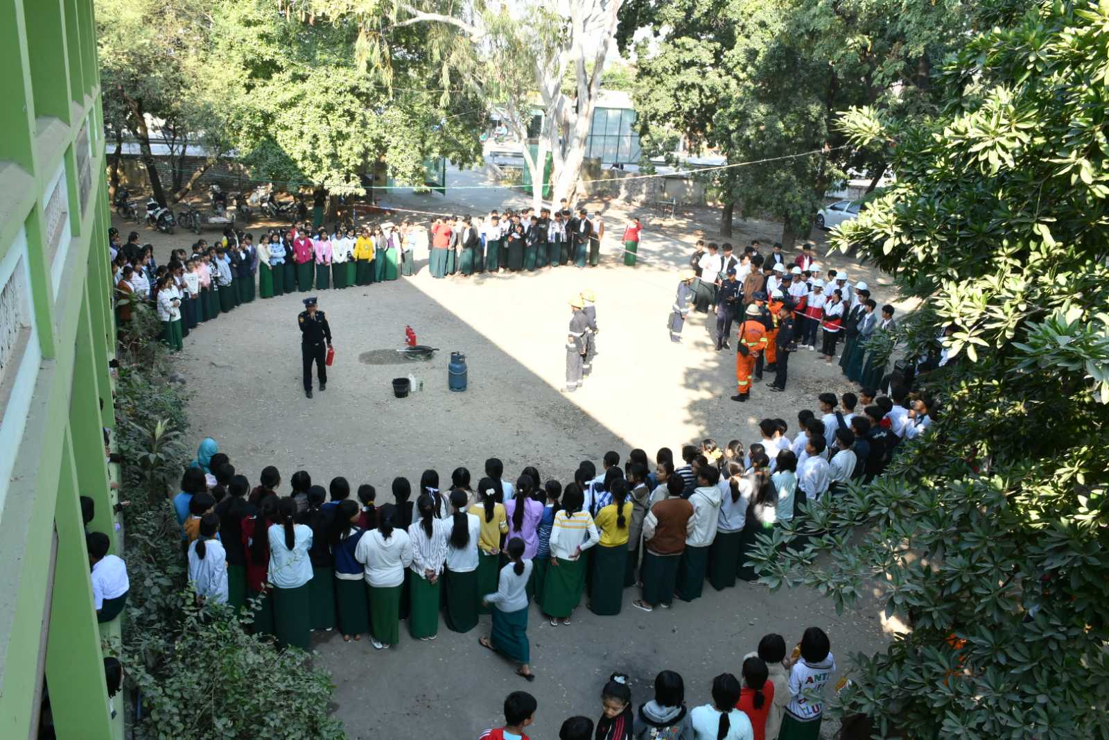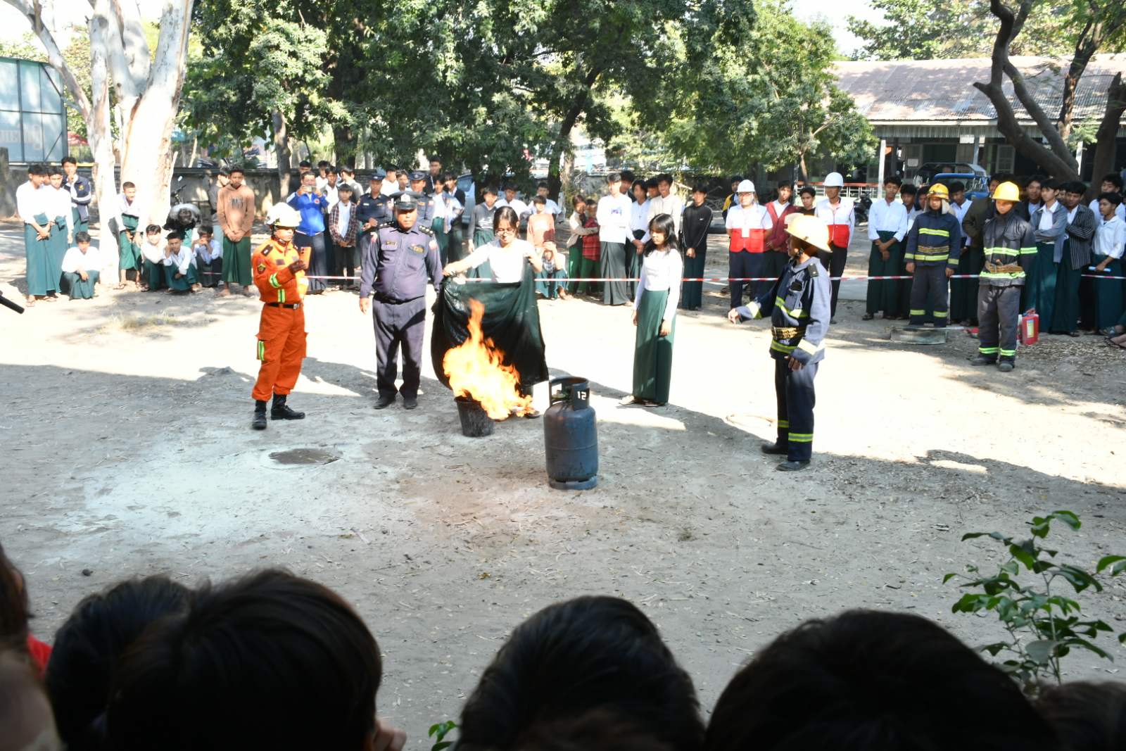 ထို့နောက် တက်ရောက်လာသည့် ကျောင်းသားကျောင်းသူများအား မီးသတ်ဦးစီးဌာနမှ ပြည်သူ့အကျိုးပြုလုပ်ငန်းများ၊ မီးဘေးအန္တရာယ်ကြိုတင်ကာကွယ်ရေးနှင့် သဘာဝဘေးလုပ်ငန်းများတွင် ပါဝင်ဆောင်ရွက်ခဲ့မှု စသည့်အကြောင်းများကို ပရိုဂျက်တာဖြင့် ရှင်းလင်းပြောကြားခဲ့သည်။ ဆက်လက်၍ အသိပညာပေး video clips များ ပြသ၍ လက်တွေ့မီးငြှိမ်းသတ်ခြင်း စသည်တို့အား ကျောင်းသား၊ ကျောင်းသူများ စိတ်ပါဝင်စားစွာဖြင့် ကိုယ်တိုင်သရုပ်ပြဆောင်ရွက်ခဲ့ကြပြီး၊ ငလျင်ပညာပေး ဇာတ်တိုက်သရုပ်ပြသခြင်းလည်း ပူးပေါင်းဆောင်ရွက်ခဲ့ကြသည်။