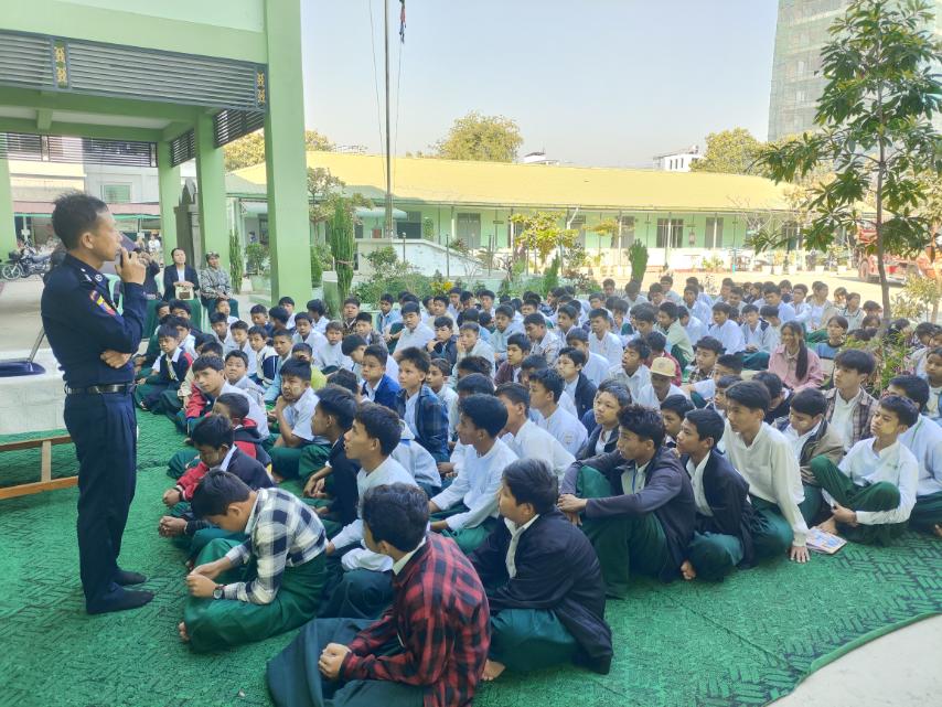 ရှေးဦးစွာ ချမ်းအေးသာစံမြို့နယ် မီးသတ်ဦးစီးမှူးရုံးမှ ဦးစီးအရာရှိ ဦးညီထွေးဦးက ဆရာ၊ ဆရာမများ၊ ကျောင်းသား၊ ကျောင်းသူများအား သဘာဝဘေးအန္တရာယ်ဆိုင်ရာ အသိပညာပေးအကြောင်းအရာများ ဟောပြောခြင်း၊ မီးငြှိမ်းသတ်ခြင်းနှင့် ရှာဖွေကယ်ဆယ်ရေး လက်တွေ့သရုပ်ပြခြင်းများကို ပြုလုပ်ခဲ့ကြသည်။