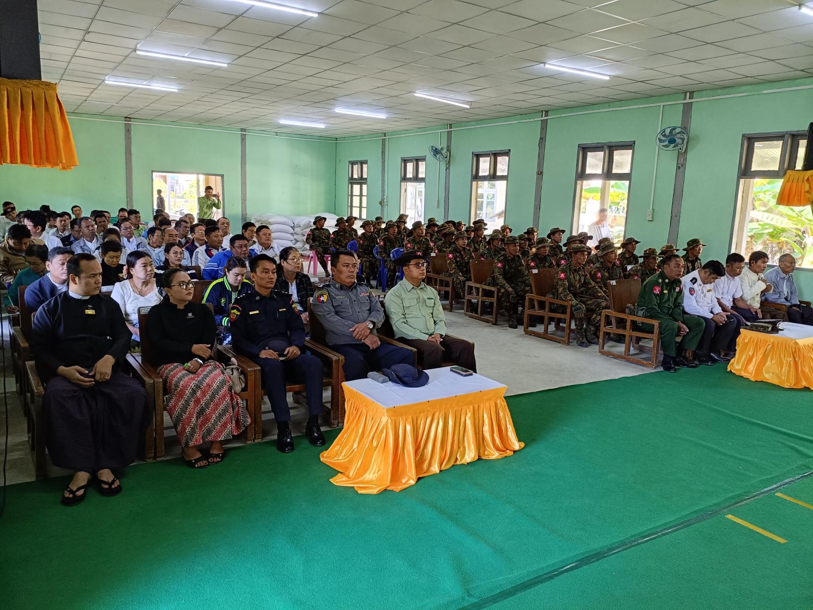 ဦးစွာ မြို့နယ်စီမံခန့်ခွဲရေးနှင့် အုပ်ချုပ်ရေးကော်မတီဥက္ကဋ္ဌ ဦးငြိမ်းမောင်မောင်က အဖွင့်အမှာစကားပြောကြားခဲ့ပြီး မြို့နယ်စီမံခန့်ခွဲရေးနှင့် အုပ်ချုပ်ရေးကော်မတီအဖွဲ့ဝင် ဗိုလ်မှူးသိန်းထိုက်က လက်နက်တပ်ဆင်ပေးအပ်ခြင်းနှင့် ပတ်သက်၍ ရှင်းလင်းပြောကြားခဲ့သည်။ ဆက်လက်၍ ပြည်သူ့လုံခြုံရေးနှင့် အကြမ်းဖက်နှိမ်နှင်းရေး(လှုပ်ရှား)အဖွဲ့အား မြို့နယ်စီမံခန့်ခွဲရေးနှင့် အုပ်ချုပ်ရေးကော်မတီဥက္ကဋ္ဌ ဦးငြိမ်းမောင်မောင်၊ မြို့နယ်စီမံခန့်ခွဲရေးနှင့် အုပ်ချုပ်ရေးကော်မတီအဖွဲ့ဝင် ဗိုလ်မှူးသိန်းထိုက်၊ မြို့နယ်စီမံခန့်ခွဲရေးနှင့် အုပ်ချုပ်ရေးကော်မတီအတွင်းရေးမှူး ယာယီရဲမှူး သန်းမင်းထက်နှင့် မြို့နယ်စီမံခန့်ခွဲရေးနှင့် အုပ်ချုပ်ရေးကော်မတီအဖွဲ့ဝင် ဦးထွန်းထွန်းနိုင်တို့က BA-64 (၂၃)လက်၊ .30 ကာဘိုင် (၈)လက်၊ MA-13 (၁၅)လက်၊ 40-mm ဗုံးပစ်လောင်ချာ (၄)လက် စသည့်လက်နက်များ ပေးအပ်ခဲ့သည်။
