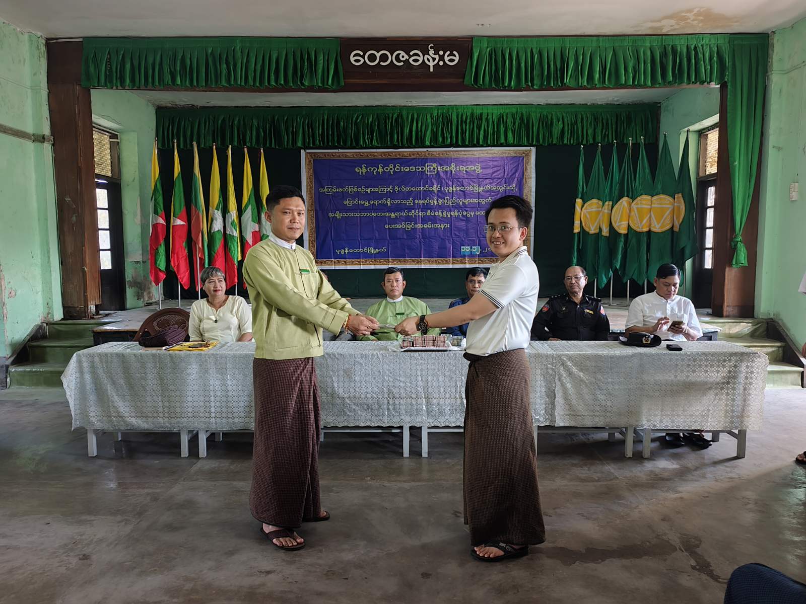 ရန်ကုန်တိုင်းဒေသကြီး၊ ဗိုလ်တထောင်ခရိုင်၊ ပုဇွန်တောင်မြို့နယ်အတွင်း ဒေသအသီးသီးမှ ယာယီနေရပ်စွန့်ခွာပြည်သူများအား အမျိုးသားသဘာဝဘေးအန္တရာယ်ဆိုင်ရာ စီမံခန့်ခွဲမှုရန်ပုံငွေမှ ၂၀၂၅ ခုနှစ်၊ ဇူလိုင်လ၊ သြဂုတ်လနှင့် စက်တင်ဘာလ (၃)လစာ အတွက် တစ်ဦးလျှင် ငွေကျပ် ၆၀,၀၀၀/ နှုန်းဖြင့် ထောက်ပံ့ငွေပေးအပ်ခြင်းအခမ်းအနားကို ယမန်နေ့ နေ့လယ် ၂ နာရီအချိန်က အမှတ်(၁၀) ရပ်ကွက်ရှိ အမှတ်(၄)အခြေခံပညာမူလတန်းကျောင်း တေဇခန်းမ၌ ကျင်းပခဲ့သည်။