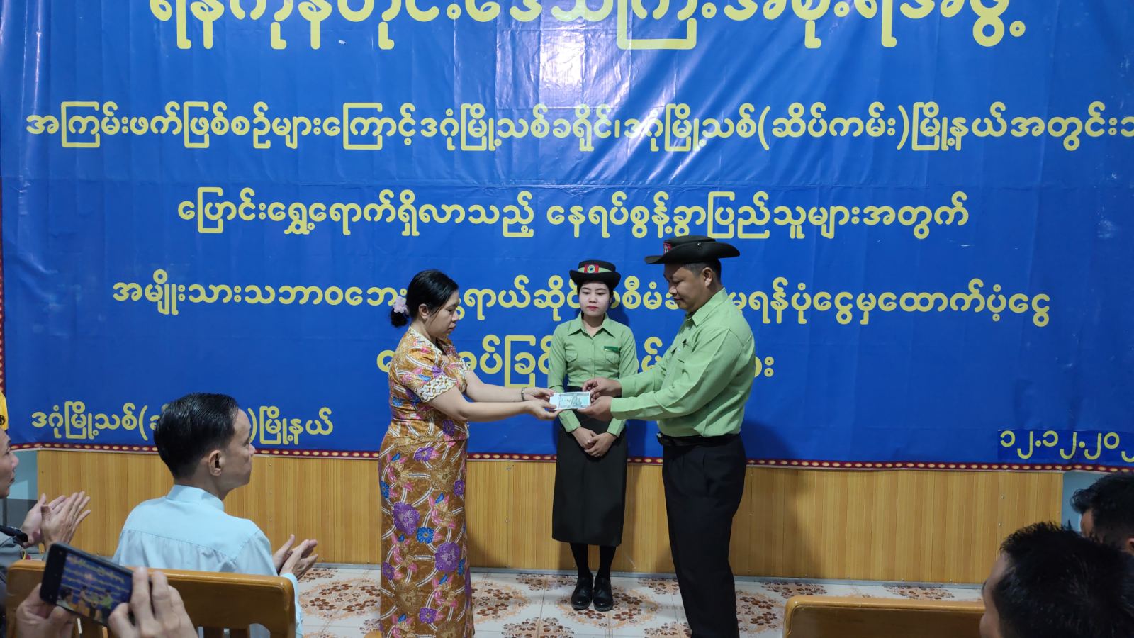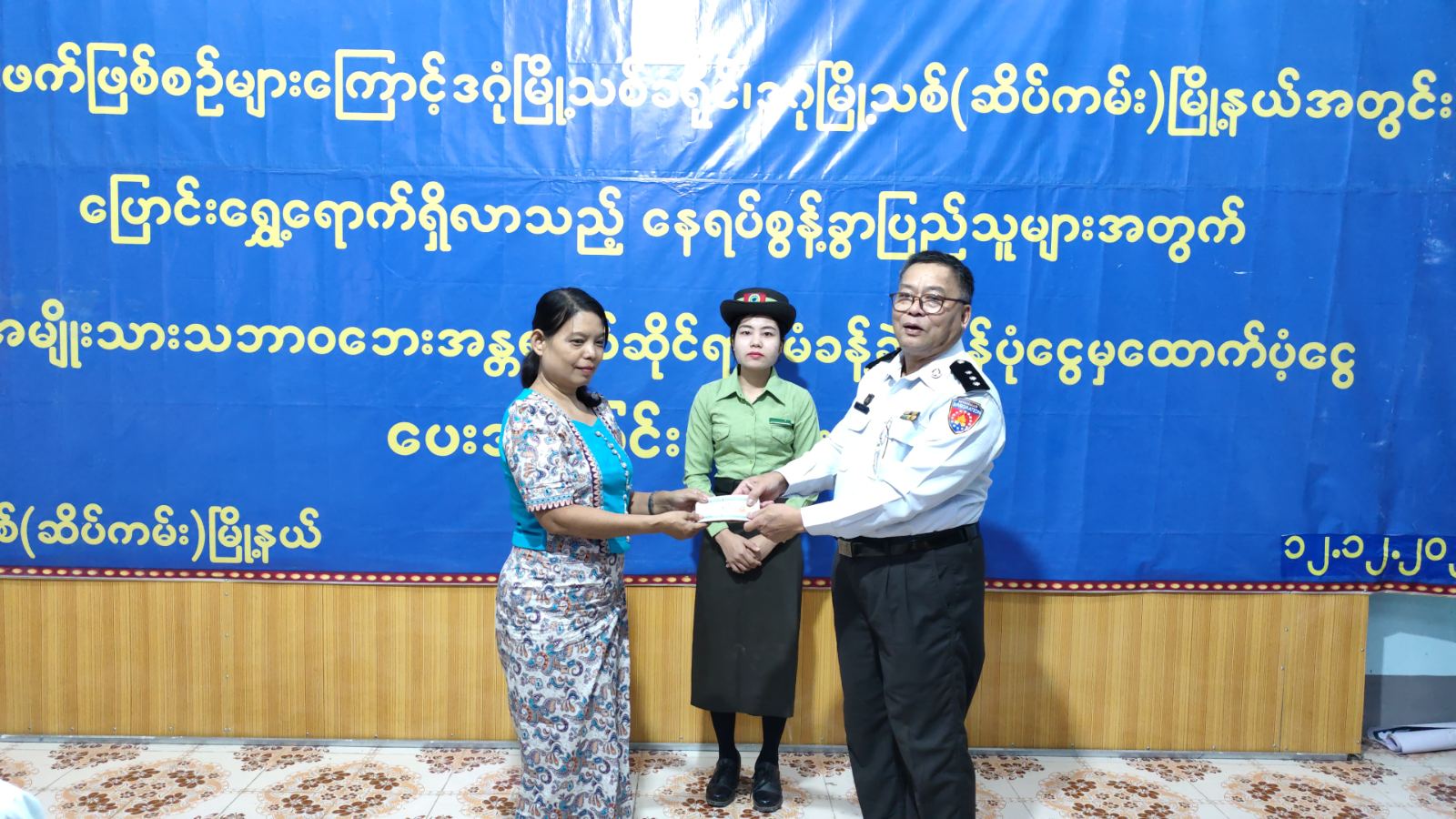 ရန်ကုန်တိုင်းဒေသကြီး၊ ဒဂုံမြို့သစ်ခရိုင်၊ ဒဂုံမြို့သစ်(ဆိပ်ကမ်း)မြို့နယ်တွင် ယာယီနေရပ်စွန့်ခွာပြည်သူများအား အမျိုးသားသဘာဝဘေးအန္တရာယ်ဆိုင်ရာစီမံခန့်ခွဲမှု ရန်ပုံငွေမှထောက်ပံ့ပေးအပ်သော ထောက်ပံ့ငွေများပေးအပ်ခြင်းကို ယနေ့နံနက် ၉ နာရီက အမှတ်(၉၄)ရပ်ကွက်၊ အိမ်ရာစီမံခန့်ခွဲရေးကော်မတီရုံးခန်းမတွင် ပြုလုပ်ခဲ့ကြောင်းသိရသည်။