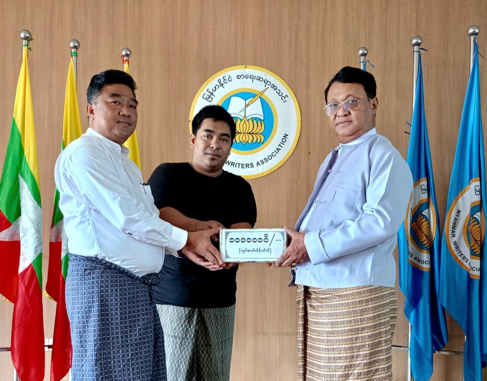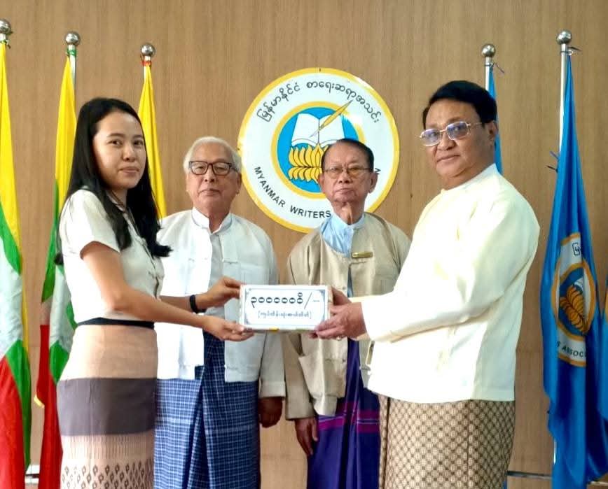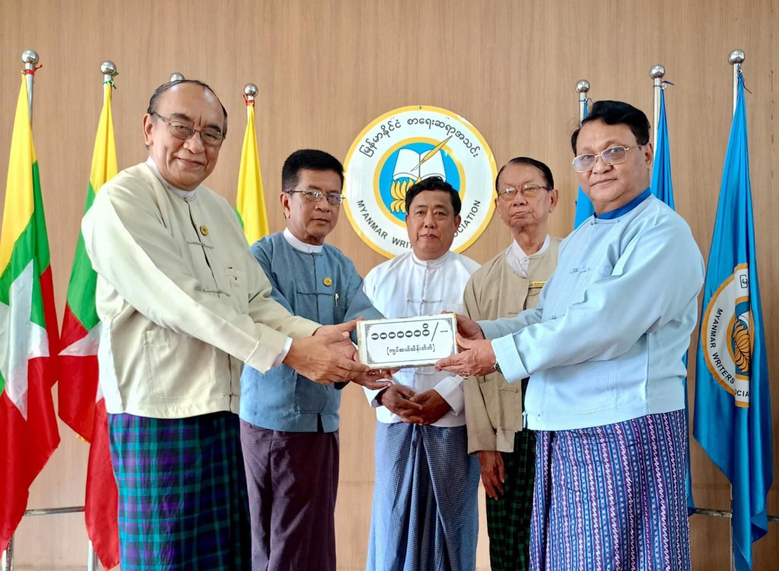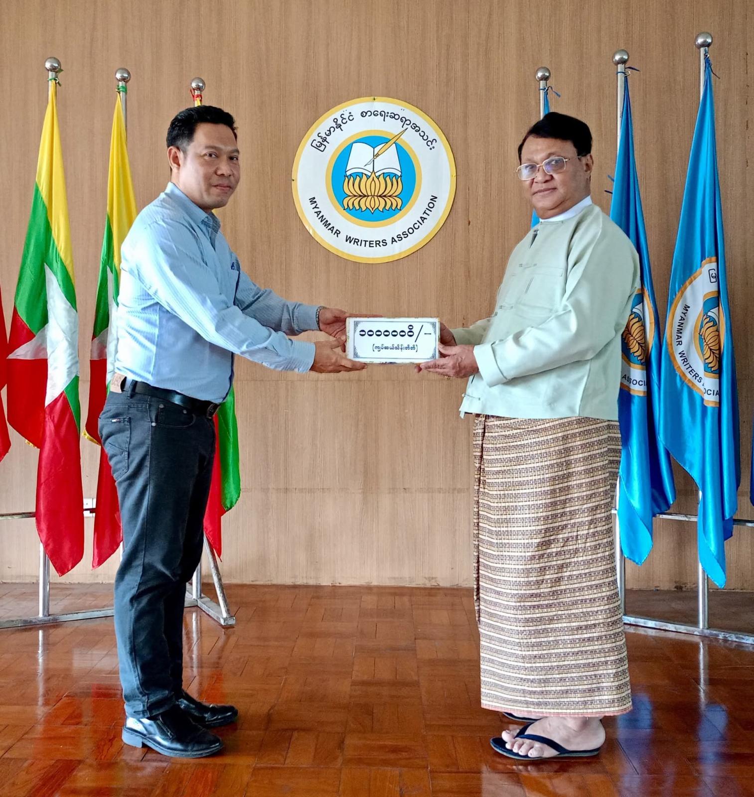 ထိုသို့လှူဒါန်းရာတွင် ပြည်ထောင်စုသမ္မတမြန်မာနိုင်ငံတော် ယာယီသမ္မတ နိုင်ငံတော်လုံခြုံရေးနှင့်အေးချမ်းသာယာရေးကော်မရှင်ဥက္ကဋ္ဌ တပ်မတော်ကာကွယ်ရေးဦးစီးချုပ် ဗိုလ်ချုပ်မှူးကြီးမင်းအောင်လှိုင်နှင့် ဇနီးဒေါ်ကြူကြူလှတို့က ငွေကျပ် (၁၄၅)သိန်းကျော် တန်ဖိုးရှိ အင်္ကျီ၊ ပုဆိုး၊ လက်ဆွဲအိတ်၊ ခြုံပဝါနှင့် ပါတိတ်လုံချည်များ၊ ဒေါက်တာခင်ခင်ရီ (ရှိုင်းဟုပ်ကုမ္ပဏီ)က အလှူငွေကျပ် သိန်း(၁၀၀)၊ ပြန်ကြားရေးဝန်ကြီးဌာနနှင့် အမျိုးသားစာပေဆုရှင် တာမိုးညဲ သီဟလွင်တို့က ငွေကျပ်သိန်း(၃၀)စီ၊ ကချင်ပြည်နယ်အစိုးရအဖွဲ့က ငွေကျပ်သိန်း(၂၀)၊ နေပြည်တော်ကောင်စီက ငွေကျပ် (၁၇၆၀၀၀၀)၊ ဒေါက်တာတင်ထွန်းဦး-ဒေါက်တာခင်မိုးမိုး (စွယ်စုံမီဒီယာဂရု)က ငွေကျပ် (၁၁)သိန်း၊ မြန်မာနိုင်ငံသတင်းမီဒီယာကောင်စီ၊ Nation Light Company Limited နှင့် ဦးကိုကိုလတ်(ရွှေအိုလတ်)တို့က ငွေကျပ် (၁၀)သိန်းစီ၊ ဆရာကြီး ဦးညွန့်ဆွေ(မောင်ဆွေသက်)-ဆရာမကြီး သရက်မသက်ဆွေ၊ ဗိုလ်မှူးချုပ်အေးမြင့်ကြူ(ငြိမ်း) (ချစ်ဆွေမြင့်)-ပါမောက္ခဒေါက်တာခင်ဆွေမြင့် (ဆွေယင်းမာ-ရန်ကုန်တက္ကသိုလ်)တို့က ငွေကျပ်ငါးသိန်းစီ၊ ဓနုဖြူမြို့နယ်စာရေးဆရာအသင်းက ငွေကျပ်(၁၂၀၀၀၀)၊ ဦးကြည်ဝင်း(ထေရအောင်)၊ ဒဂုံမြို့သစ်(မြောက်ပိုင်း)မြို့နယ် စာရေးဆရာအသင်း၊ စမ်းချောင်းမြို့နယ် စာရေးဆရာအသင်း၊ ကျောက်တန်းမြို့နယ် စာရေးဆရာအသင်းနှင့် မိုးညှင်းမြို့နယ် စာရေးဆရာအသင်းတို့က ငွေကျပ်တစ်သိန်းစီ၊ မမိုးအေး(ကိုယ်တိုင်ရေး)၊ ဒေါက်တာဗိုလ်သံမဏိ(တောင်တွင်းကြီး)နှင့် ဒဂုံမြို့နယ် စာရေးဆရာအသင်းတို့က ငွေကျပ်ငါးသောင်းစီ၊ ဦးကျော်ဇေယျထွန်း(ဇေယံ)က ငွေကျပ်နှစ်သောင်း၊ ဦးထွန်းနေလင်း(သျှင်သီရိနေ)က ငွေကျပ်(၂၅၉၂၀၀၀)တန်ဖိုးရှိ စာအုပ် (၂၈၈)အုပ် အသီးသီးပေးအပ်လှူဒါန်းကြရာ အသင်းဥက္ကဋ္ဌ ဦးအုန်းမောင်(မြင်းမူမောင်နိုင်မိုး)၊ ဒုတိယဥက္ကဋ္ဌ(၁) ဦးမျိုးထွန်း (မောင်စိမ်းနောင်-လယ်ဝေး)၊ အတွင်းရေးမှူး ဦးညွန့်တင်(မောင်ငြိမ်းသူ-ကြို့ပင်ကောက်)နှင့် တာဝန်ရှိသူများက လက်ခံရယူပြီး ကျေးဇူးတင်စကား ပြန်လည်ပြောကြားသည်။