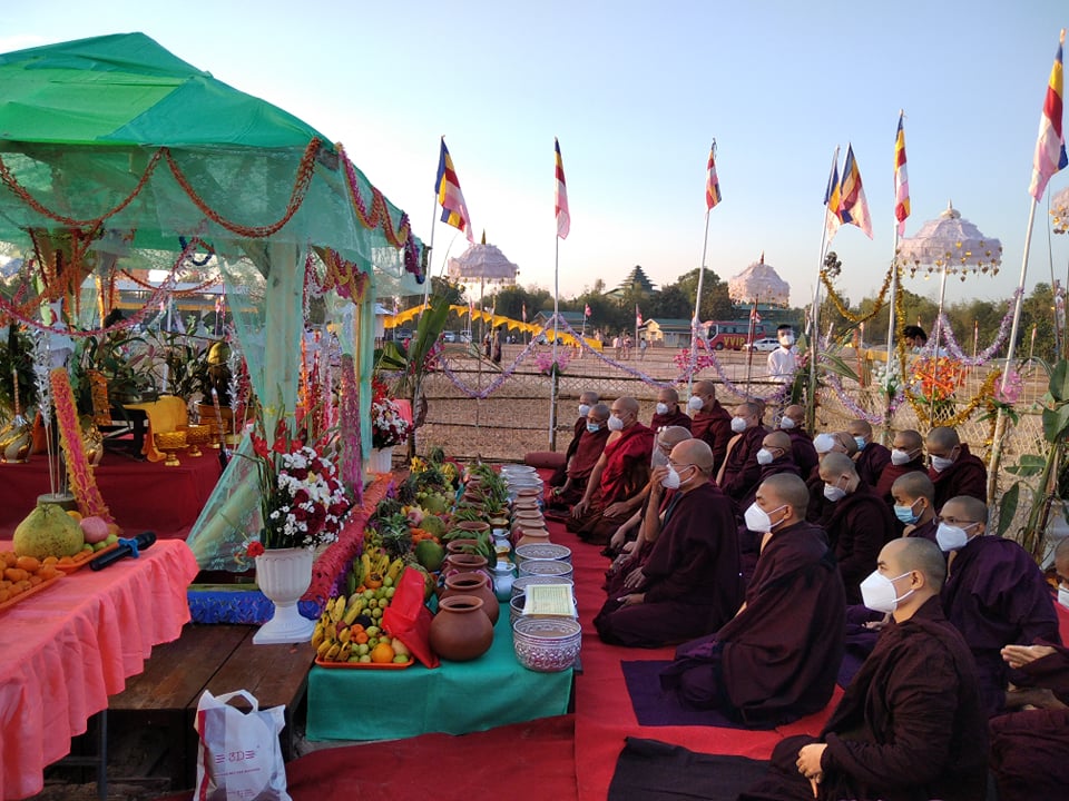 ထို့နောက် ဥပဿကာများက ပရိတ်သဲ၊ ပရိတ်ရေစင်တို့ကို အလယ်ဗဟိုမှ ကုန်းတော်အနှံ့ လက်ယာရစ် အတိုင်း နှံ့စပ်အောင်ပက်ဖျန်းခြင်း၊ ပရိတ်ချည်များကို စေတီတည်ထားမည့် ဘေးပရဝုဏ် ပတ်လည်ရှိ သစ်ပင်ကြီးများ ပေါ်သို့ တက်ရောက်ချည်နှောင်ခြင်း၊ အောင်ဂါထာ ရွတ်ဖတ်ပူဇော်ခြင်းများ ဆောင်ရွက်ပြီး ဗုဒ္ဓသာသနံစိရံတိဋ္ဌတု (၃)ကြိမ်ရွတ် ဆိုကာ အခမ်းအနားကို ရုပ်သိမ်းခဲ့ကြသည်။ မဟာအတုလမြတ်ဗုဒ္ဓစွမ်းအား စေတီတော်မြတ်ကြီး မြောင်းမြမြို့၊ ရိပတ္တိစွမ်းအားတောရဓမ္မရိပ်သာကျောင်း သြဝါရစရိယဆရာတော် ဘဒ္ဒန္တသူရပတ္တိ၏ ဦးဆောင်မှုဖြင့် ဉာဏ်တော်(၂၇၀) ပေရှိရွှေတိဂုံစေတီပုံစံတူ တည်ထားပူဇော်မည်ဖြစ်ကြောင်း သိရသည်။