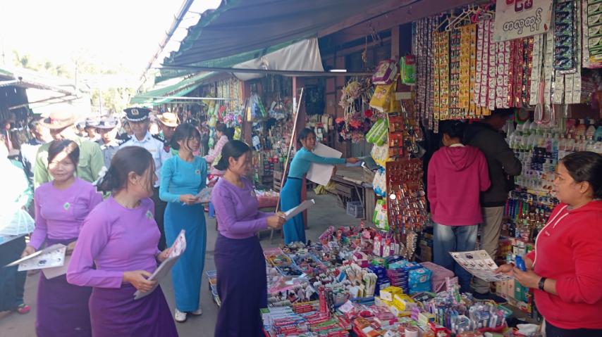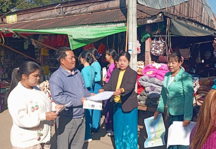 ထို့နောက် ဗိုလ်ချုပ်လမ်းမကြီး တစ်လျှောက်နှင့်လူစည်ကားရာ မြို့မဈေးအတွင်းရှိ ဈေးရောင်းသူ၊ဈေးဝယ်သူ များထံသို့ ဒို့အတူတူမဲပေးကြမယ်၊ ရွေးကောက်ပွဲမှသည် ပိုမိုကောင်းမွန်သော အနာဂတ်ဆီသို့ စသည့်ရွေးကောက်ပွဲဆိုင်ရာ အသိပညာပေး လက်ကမ်းစာစောင်များ ဖြန့်ဝေပေးခဲ့ကြောင်း သိရသည်။