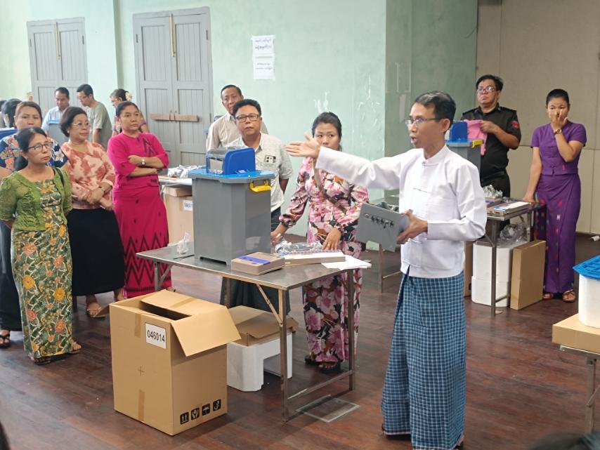 ထိုသို့ မဲရုံများတွင်အသုံးပြုမည့် မြန်မာအီလက်ထရောနစ် မဲပေးစက် (MEVM) များ တပ်ဆင်ပုံသရုပ်ပြခြင်းနှင့် လက်တွေ့ဆောင်ရွက်နေမှုများကို မြို့နယ်စီမံခန့်ခွဲရေးနှင့် အုပ်ချုပ်ရေးကော်မတီဥက္ကဋ္ဌ ဦးမိုးထွေးနှင့်အဖွဲ့ဝင်များ၊ မြို့နယ်ရွေးကောက်ပွဲကော်မရှင်အဖွဲ့ခွဲဝင်များက အနီးကပ်ကြီးကြပ်လျက်ရှိကြောင်း သိရသည်။