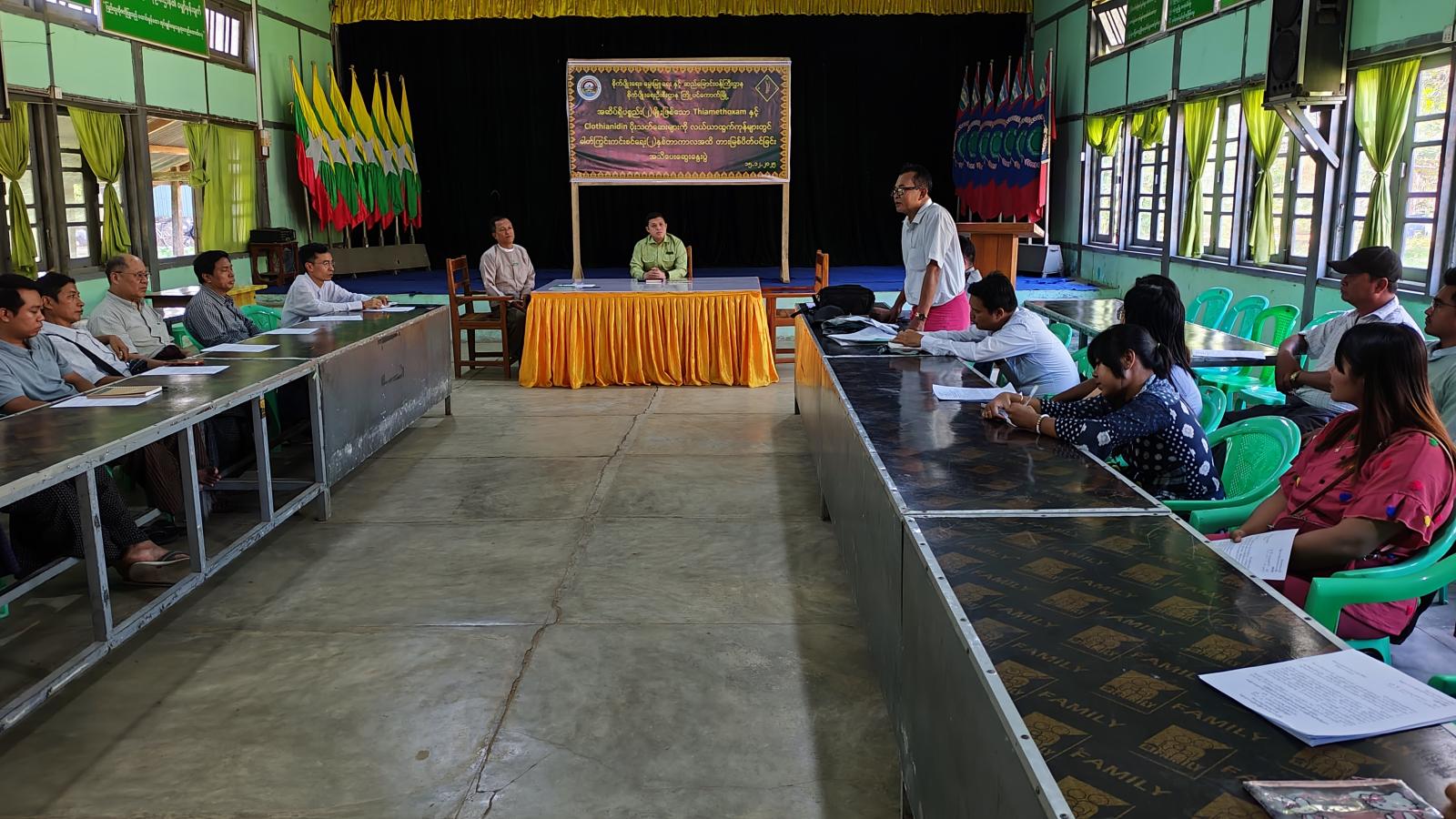ရှေးဦးစွာ မြို့နယ်စီမံခန့်ခွဲရေးနှင့်အုပ်ချုပ်ရေးကော်မတီဥက္ကဋ္ဌ ဦးအောင်ဇော်မင်းက အဖွင့်အမှာ စကားပြောကြားပြီး မြို့နယ်စိုက်ပျိုးရေးဦးစီးဌာန မြို့နယ်ဦးစီးမှူး ဦးမောင်မောင်ဌေးက အဆိပ်ရှိပစ္စည်း(၂)မျိုးဖြစ်သော Thiamethoxam နှင့် Clothianidin ပိုးသတ်ဆေးများသည် လယ်ယာထွက်ကုန်များတွင် ပြည်ပပို့ကုန်များနှင့် စားသုံးသူပြည်သူများ ထိခိုက်နိုင်သော ဓာတ်ကြွင်းကျန်ရှိမှုများသောကြောင့် အဆိုပါပိုးသတ်ဆေးအား ရောင်းချခြင်းမပြုရန်နှင့် အမိန့်ညွှန်ကြးချက်အား လိုက်နာဆောင်ရွက်ခြင်းမရှိပါက ပိုးသတ်ဆေးဥပဒေအရ အရေးယူခံရမည်ဖြစ်ကြောင်း တောင်သူများ၏ စိုက်ပျုးသီးနှံများ ပန်းတိုင်အထွက်နှုန်းရရှိရေး ဘေးအန္တရာယ်ကင်းရှင်းပြီး အရည်အသွေးပြည့်မီသော သီးနှံများရရှိရေးတို့အတွက် စံချိန်စံညွှန်းနှင့် ကိုက်ညီသော မြေဩဇာ ပိုးသတ်ဆးများကိုသာ ရောင်းချသွားရန် အသိပညာပေးဆွေးနွေးခဲ့သည်။