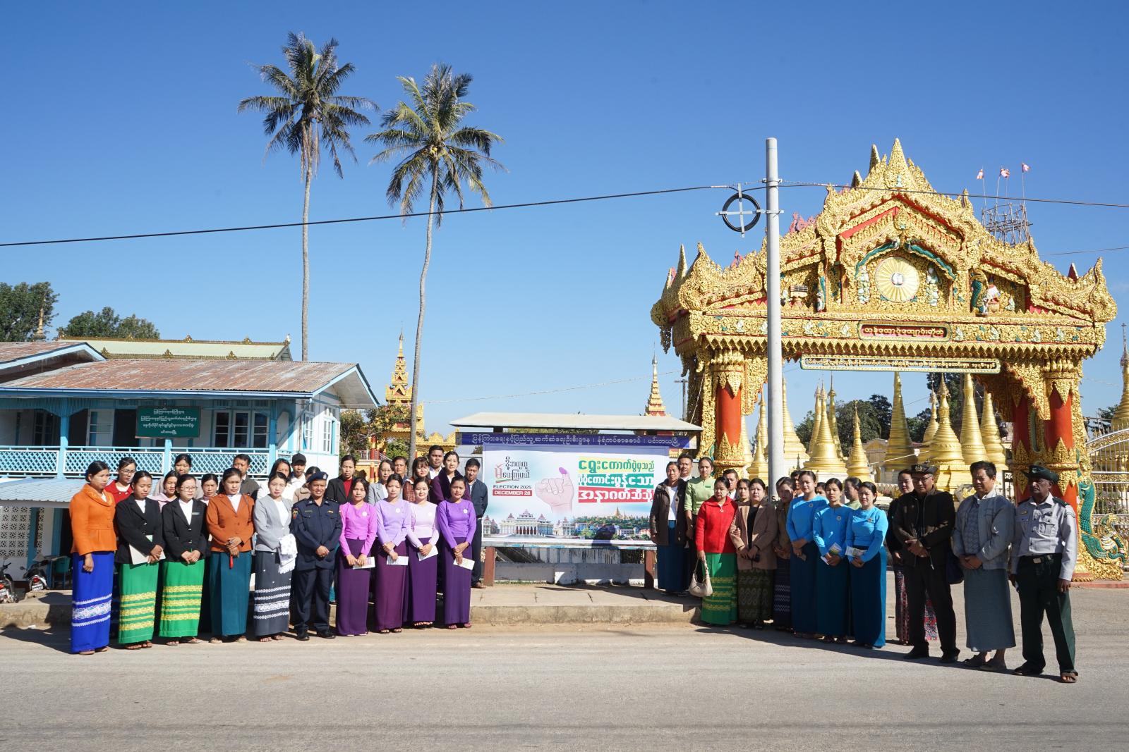 ထိုသို့ ဆောင်ရွက်ရာတွင် မြို့နယ်စီမံခန့်ခွဲရေးနှင့်အုပ်ချုပ်ရေးကော်မတီ အဖွဲ့ဝင်များ၊ ဒေသနှင့် မြို့နယ်ရွေးကောက်ပွဲကော်မရှင်အဖွဲ့ခွဲ အဖွဲ့ဝင်များ၊ ဒေသနှင့်မြို့နယ်အဆင့်ဌာနဆိုင်ရာ တာဝန်ရှိသူများနှင့် အသင်းအဖွဲ့များမှ လူစည်ကားရာနေရာ၌ ဒို့အတူတူမဲပေးကြမယ်၊ ရွေးကောက်ပွဲမှသည် ပိုမိုကောင်းမွန်သော အနာဂတ်ဆီသို့ ပိုစတာအား ပြည်သူများ သိရှိစေနိုင်ရန်အတွက် ဆောင်ရွက်ခဲ့ကြကြောင်း သိရသည်။