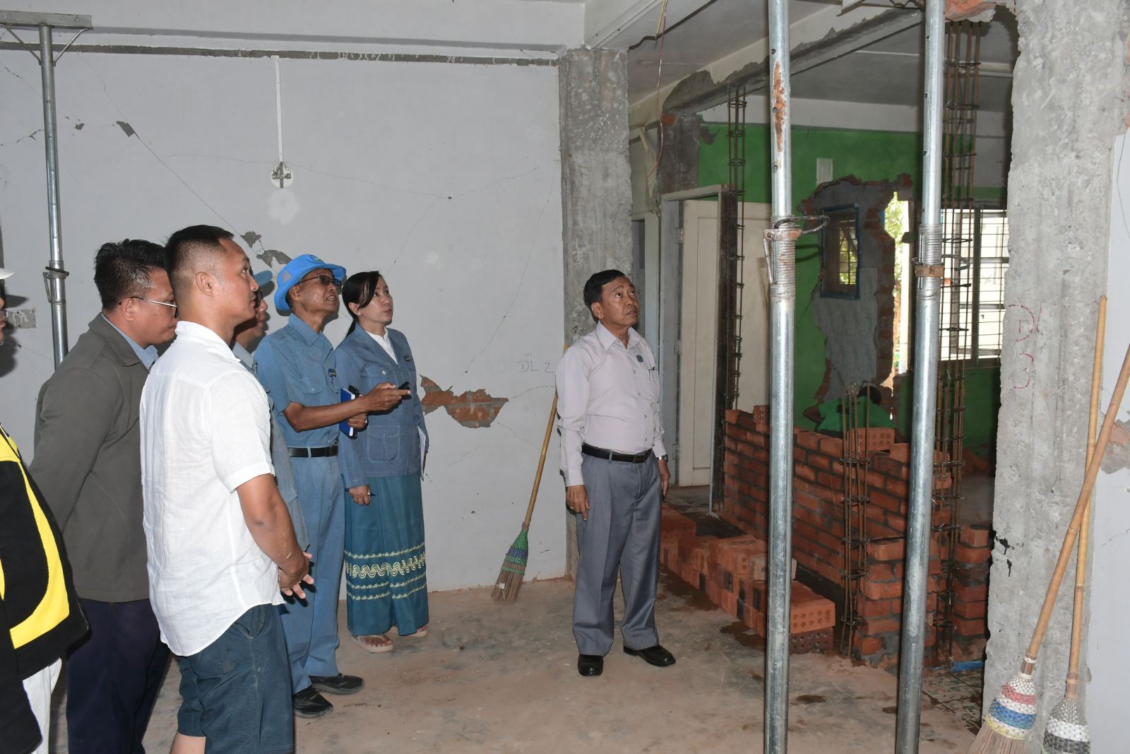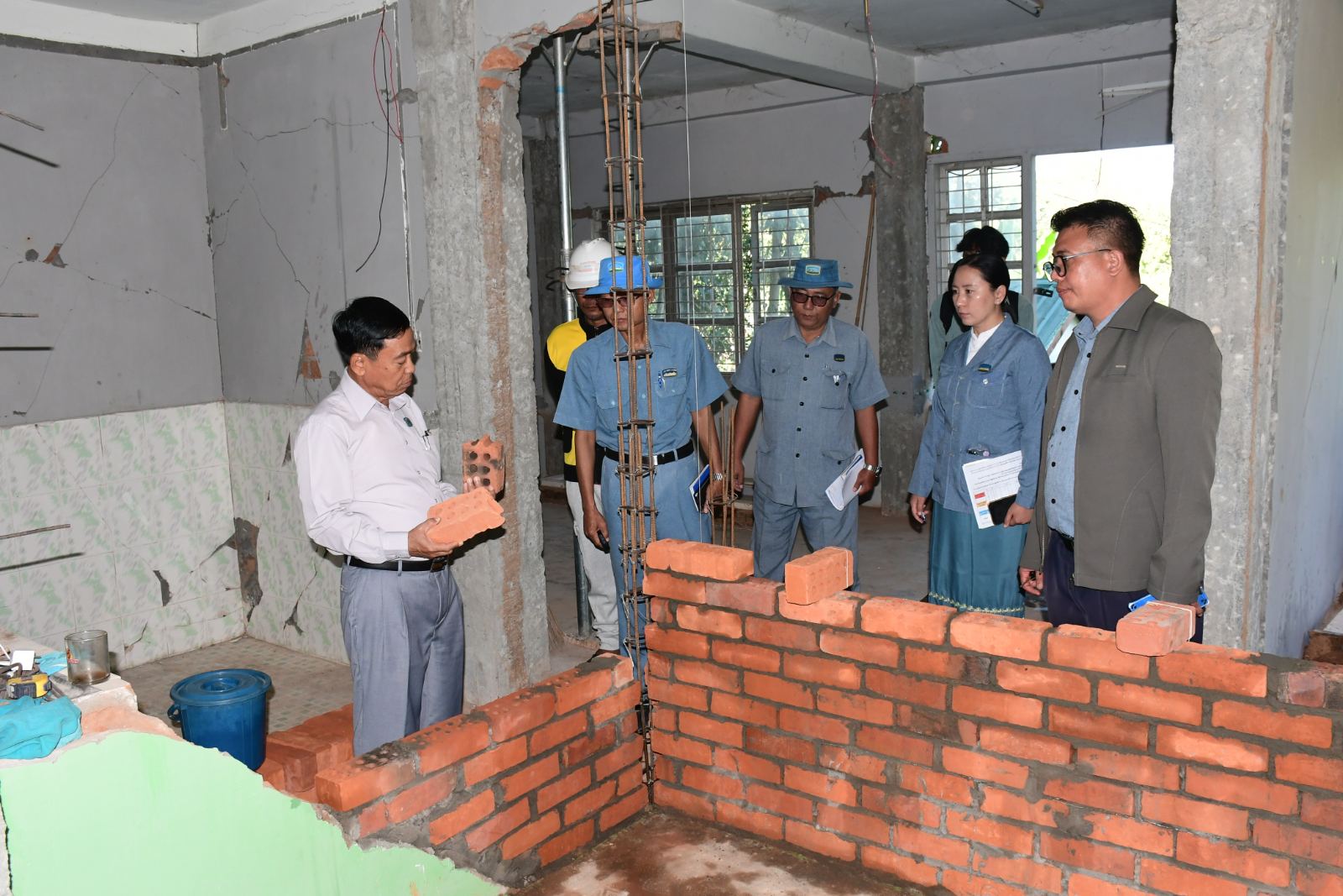 ထို့နောက် နေပြည်တော်ကောင်စီဥက္ကဋ္ဌသည် ငလျင်ဘေးကြောင့်ထိခိုက်ပျက်စီးခဲ့သည့် နေပြည်တော်၊ ဇမ္ဗူသိရိမြို့နယ်၊ ပညာ့သိဒ္ဓိရပ်ကွက်ရှိ ခရေအိမ်ရာအဆောက်အဦအမှတ် ၁၂၅ နှင့် ဉာဏသိဒ္ဓိရပ်ကွက်ရှိ အဆောက်အဦအမှတ် ၃၃၀၉ တို့ ပြန်လည်ပြုပြင်ဆောင်ရွက်နေမှုအခြေအနေများကို ကြည့်ရှုစစ်ဆေးပြီး တာဝန်ရှိသူများ၏ တင်ပြချက်များအပေါ် နေပြည် တော်ကောင်စီဥက္ကဋ္ဌက လုပ်ငန်းများအပိုင်းလိုက် အမြန်ပြီးစီးအောင် ဆောင်ရွက်ရေး၊ ရေရှည်ခိုင်ခံ့မှုရှိအောင် စံချိန်စံညွှန်းနှင့်အညီဆောင်ရွက်ရေး၊ လူအင်အား၊ စက်ယန္တရားအင်းအား တိုးမြှင့်ပြီး လုပ်ငန်းများ အပိုင်းလိုက်အမြန်ပြီးစီးအောင် အင်တိုက်အားတိုက် ဆောင်ရွက်ရန် မှာကြားသည်။