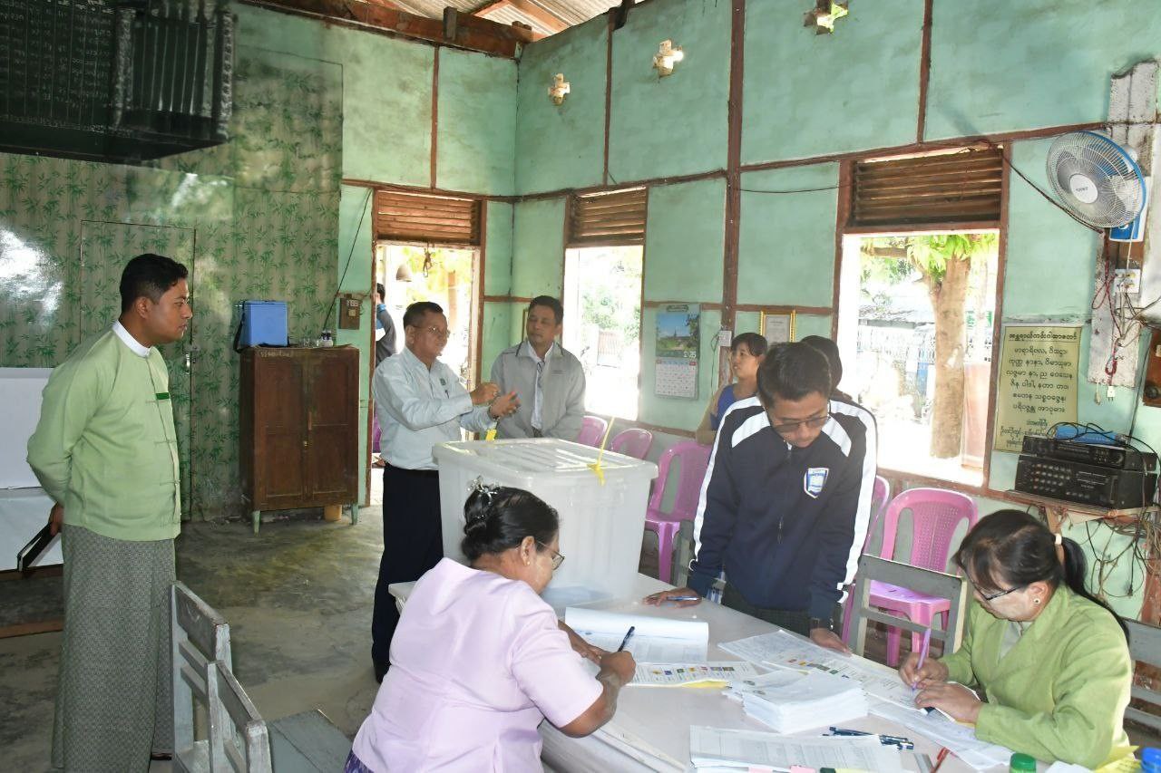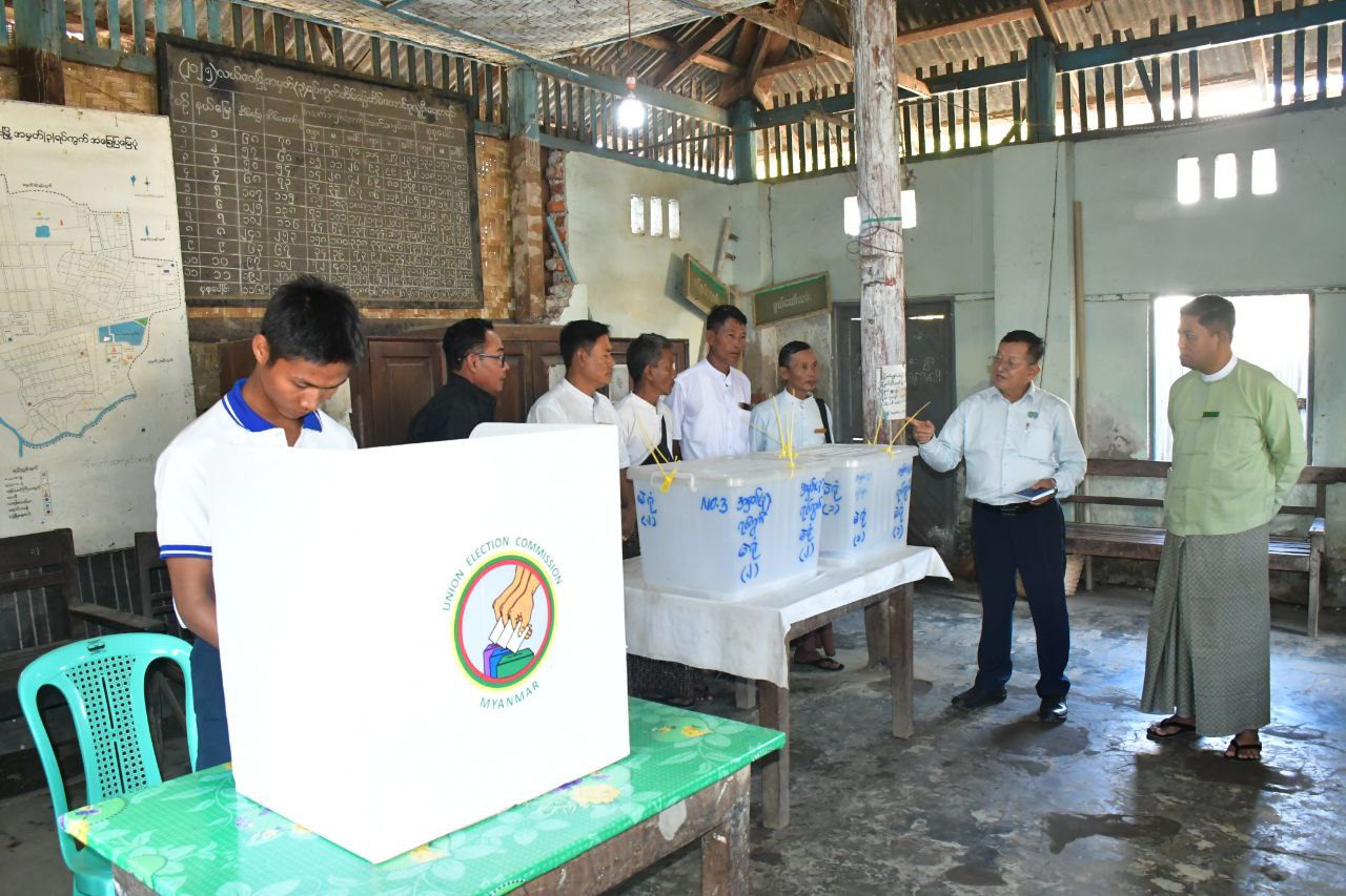 ရှေးဦးစွာ နေပြည်တော်ကောင်စီဝင်သည် လယ်ဝေးမြို့နယ် စီမံခန့်ခွဲရေးနှင့်အုပ်ချုပ်ရေးကော်မတီဥက္ကဋ္ဌ ဦးကျော်သူရနှင့် ကော်မတီဝင်များ၊ မြို့နယ်ရွေးကောက်ပွဲကော်မရှင်အဖွဲ့ခွဲဥက္ကဋ္ဌနှင့်အဖွဲ့ဝင်များ၊ တာဝန်ရှိသူများလိုက်ပါလျက် အမှတ် (၃) ရပ်ကွက်၊ ရပ်ကွက်ရွေးကောက်ပွဲကော်မရှင်အဖွဲ့ခွဲရုံး၌ ၂၀၂၅ ခုနှစ်၊ ပါတီစုံဒီမိုကရေစီအထွေထွေရွေးကောက်ပွဲတွင် တာဝန်ထမ်းဆောင်ကြမည့်ဝန်ထမ်းများ ကြိုတင်ဆန္ဒမဲပေးနေမှုအား ကြည့်ရှုအားပေးသည်။
