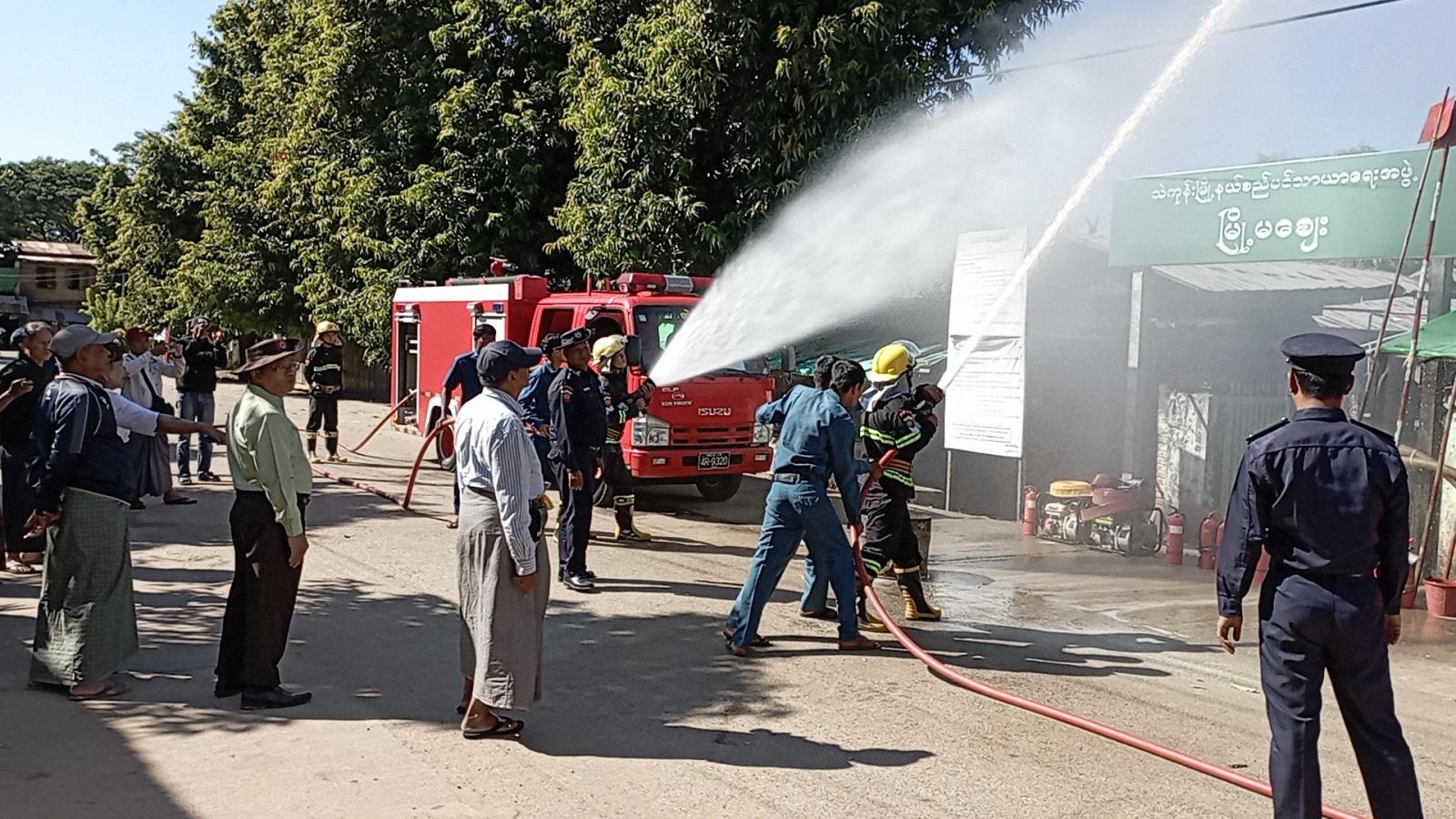 မြို့နယ်မီးသတ်တပ်ဖွဲ့နှင့် မြို့နယ်စည်ပင်သာယာရေးအဖွဲ့တို့ပူးပေါင်း၍ မီးဘေးကာကွယ်ရေး လေ့ကျင့်ရာတွင် မြိုနယ်မီးသတ်ဦးစီးအရာရှိ ဦးကိုကိုနိုင် ဦးဆောင်ပြီး (DCP) မီးသတ်ဆေးဘူးအသုံးပြုနည်းအားရှင်းလင်းပြသပြီး၊ ရုတ်တရက်မီးဘေးအန္တရာယ် ကြုံတွေ့ပါက (DCP)မီးသတ်ဆေးဘူးဖြင့် လက်တွေ့မီးငြှိမ်းသတ်နည်း၊ (HNE) မီးငြိမ်းသတ်ရေး ကိရိယာဖြင့် မီးငြိမ်းသတ်နည်းများတို့ကို လက်တွေ့ပြသသည်။ ထို့နောက် သန္ဓေမီးသတ်တပ်ဖွဲ့ဝင်များနှင့် အရန်မီးသတ်တပ်ဖွဲ့ဝင်များက မီးငြိမ်းသတ်ယာဉ် တစ်စီး၊ ရေသယ်ယာဉ်တစ်စီးဖြင့် ဇာတ်တိုက်သရုပ်ပြသပြီး တက်ရောက်လာသူများအား မီးဘေးလုံခြုံရေး အသိပညာပေးလက်ကမ်းစာစောင်များ ဖြန့်ဝေပေးခဲ့ကြသည်။