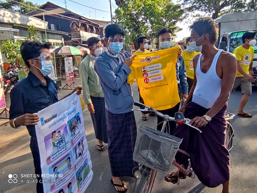 ယင်းသို့ဆောင်ရွက်ရာတွင် ဈေးဝယ်လာသူများ ၊ဈေးရောင်းသူများ ၊လမ်းသွားလမ်းလာများ၊ ကယ်ရီဆွဲသူများ အား ကိုဗစ်-၁၉ ရောဂါ ကာကွယ်ရေး Mask တပ်ပါ၊ လက်ဆေးပါ၊ ခပ်ခွာခွာ နေပါ၊ တစ်ဦးကို တစ်ဦး အသိပေးပါ၊ သတိပေးပါ စာတမ်းများပါရှိသည့် တီရှပ်များ၊ နှာခေါင်း စည်း Mask များကို ရန်ကုန်တောင်ပိုင်းခရိုင်၊ အထွေထွေအုပ်ချုပ်ရေးဦးစီးဌာန၊ ခရိုင် အုပ်ချုပ် ရေးမှူး ဦးနေဝင်းအောင်၊ သန်လျင မြို့နယ်အုပ်ချုပ်ရေးမှူး ဦးအောင်ကိုထွန်း၊ မြို့နယ်ပြည်သူ့ ကျန်းမာရေး ဦးစီးမှူး ဒေါက်တာမြကြေးမုံ၊ သန်လျင်မြို့နယ်စည်ပင် သာယာရေး ကော်မတီ ဥက္ကဋ္ဌ ဦးရဲမြင့်နှင့် ကော်မတီဝင်များ ၊မြို့နယ်စည်ပင် အမှုဆောငိအရာရှိ ဦးသိုက်စိုးနှင့် လူမှုရေး အသင်းအဖွဲ့များက လိုက်လံပေးဝေပြီး အသိပညာပေး ဆောင်ရွက်ခဲ့ ကြောင်း သိရသည်။