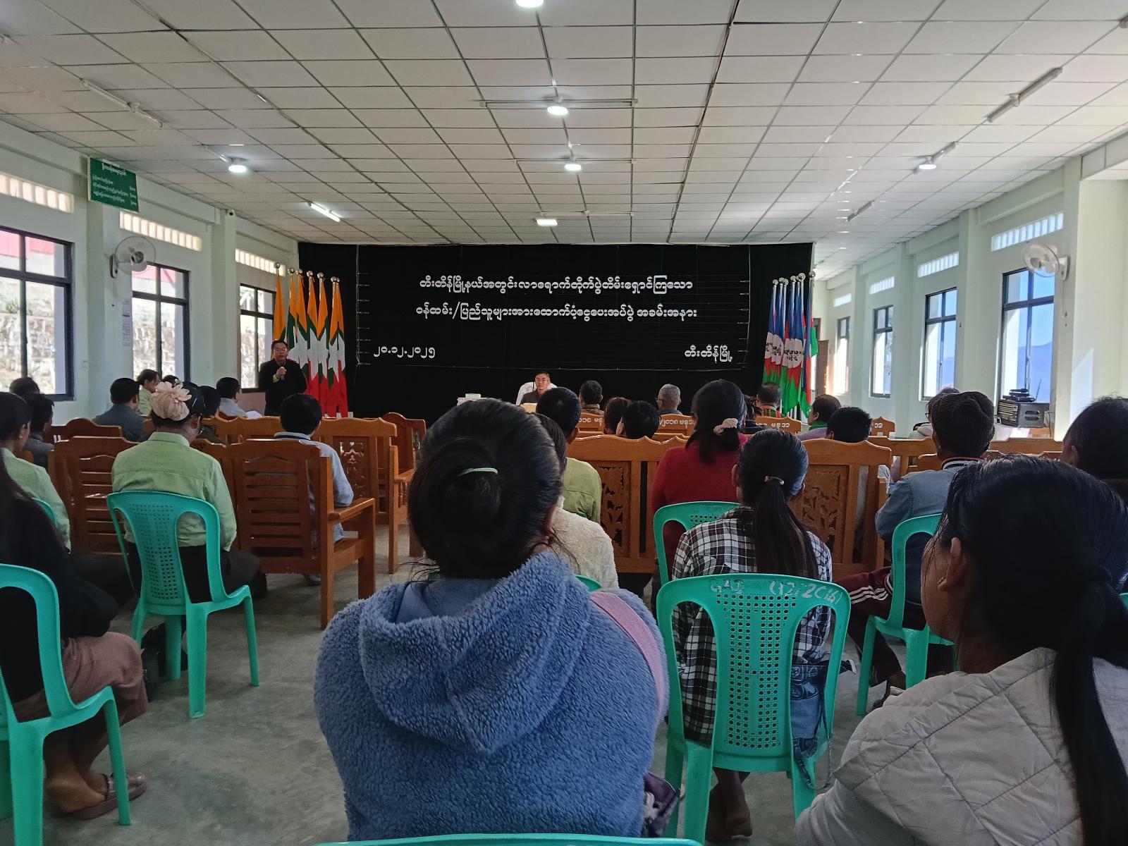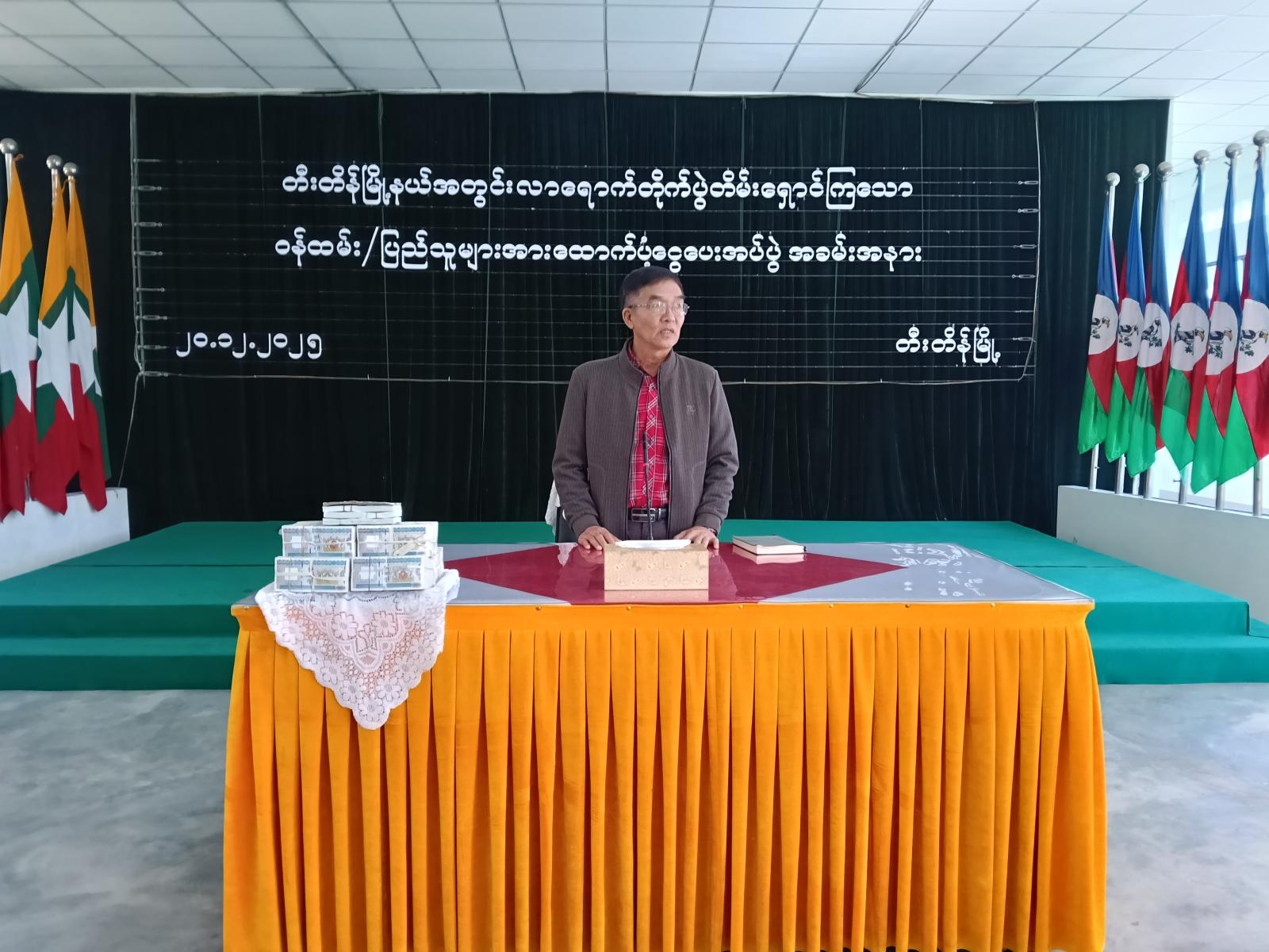 ချင်းပြည်နယ်အစိုးရ၏ အစီအစဉ်ဖြင့်တီးတိန်မြို့၌ တီးတိန်ခရိုင်နှင့်တီးတိန်မြို့နယ်အတွင်း ယာယီနေရပ်စွန့်ခွာသူနိုင်ငံ့ဝန်ထမ်းများနှင့် ပြည်သူများထောက်ပံ့ငွေပေးအပ်ပွဲအခမ်းအနားကို ယမန်နေ့နံနက် ၁၀ နာရီက မြို့နယ်အထွေထွေအုပ်ချုပ်ရေးဦးစီးဌာန အစည်းအဝေးခန်းမတွင် ပြုလုပ်သည်။