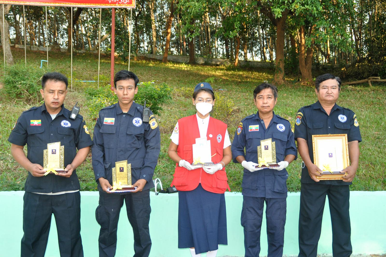 အဆိုပါဆုချီးမြှင့်ရာတွင် ရွှေမြင့်မိုရ်နာရေးကူညီမှုအသင်း မှ ဦးသန်းဖေဦး ၊ ဦးစိုးထွန်း နှင့် ဦးအောင်ချမ်းကို အားလည်းကောင်း၊ ရွာလွတ်လူမှုကယ်ဆယ်ရေးအသင်းမှ ဦးစိုးသီဟ အားလည်းကောင်း မြို့နယ် ကြက်ခြေနီအသင်းခွဲ မှ ဒေါ်ယုယမြတ်နိုး တို့အား ဂုဏ်ပြုဆုချီးမြှင့်ပြီး ဂုဏ်ပြုမှတ်တမ်းလွှာများကို ရွှေမြင့်မိုရ်နာရေးကူညီမှုအသင်း၊ ရွာလွတ်လူမှုကယ်ဆယ်ရေးအသင်း၊ ဘဝ အလင်းရောင် (ဝယ်လမ်း) လူမှုကယ်ဆယ်ရေးအသင်း တို့အား အမျိုးသားလွှတ်တော်ကိုယ်စားလှယ် ဦးလင်းတင်ဌေး၊ မြို့နယ် အုပ်ချုပ်ရေးမှူး ဦးမျိုးသိုက်ထွန်းနှင့် မြို့နယ်ဆရာဝန်ကြီး ဒေါက်တာသူဇာဝင်း တို့က ပေးအပ်ချီးမြှင့်ခဲ့သည်။