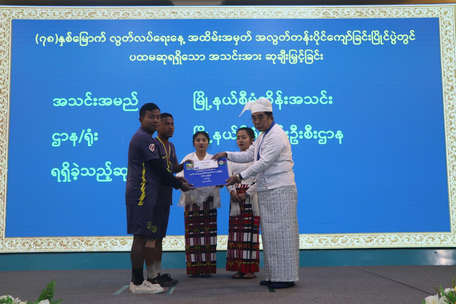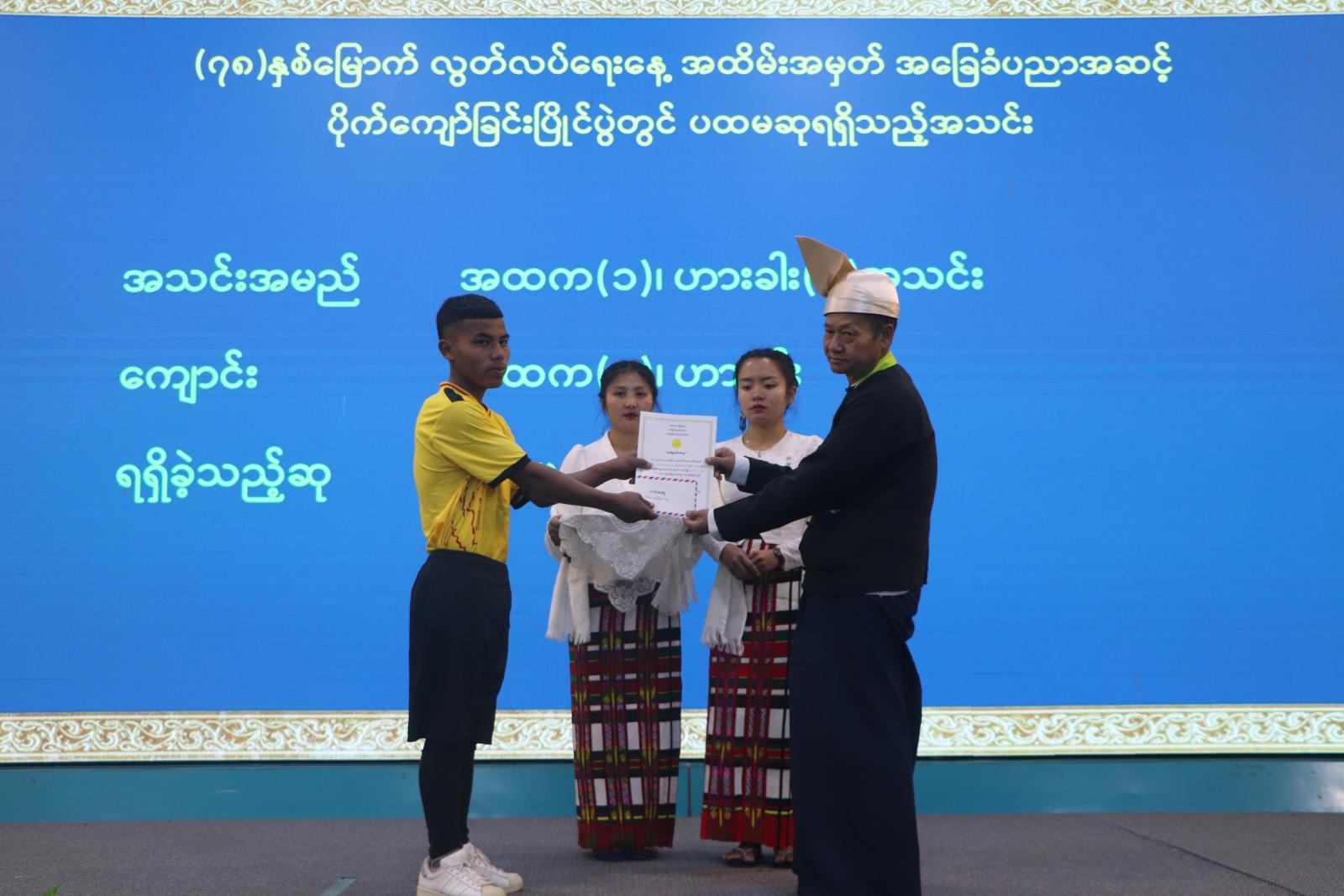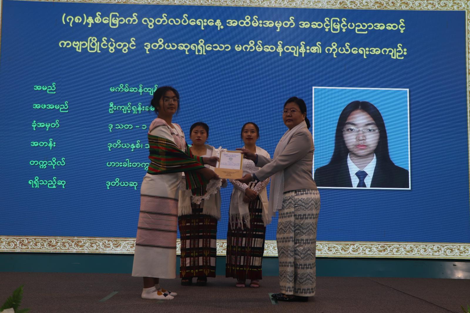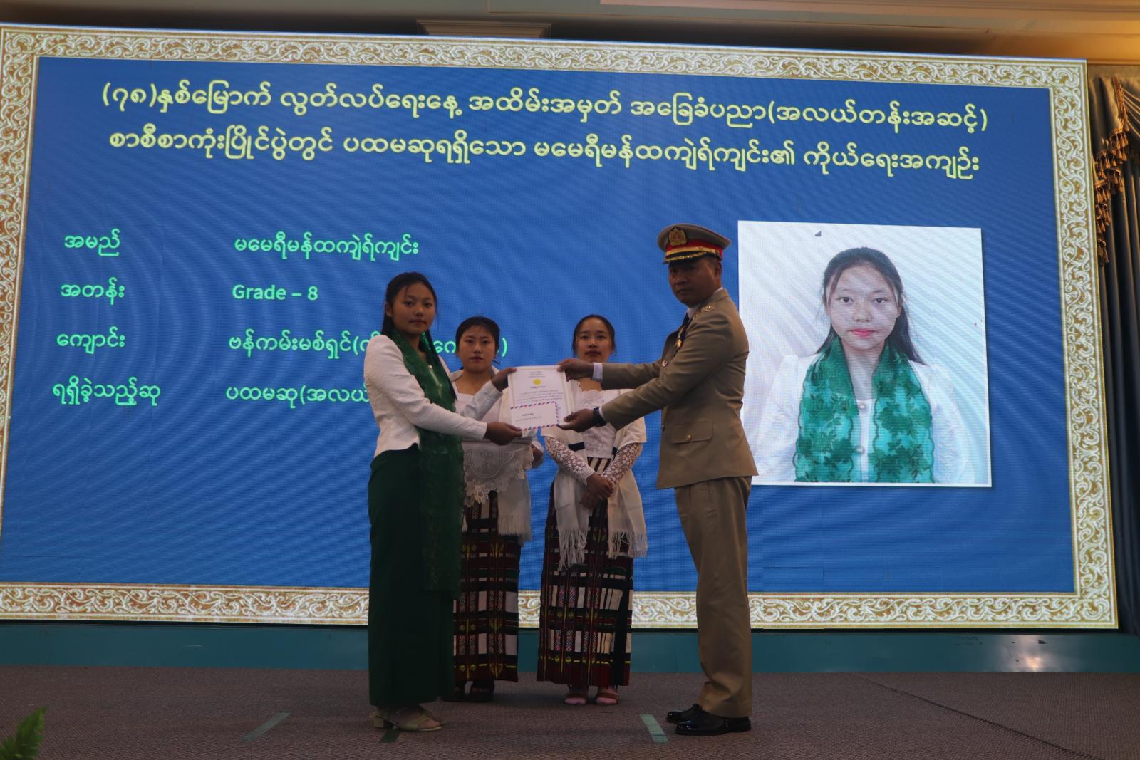 ထို့နောက် (၇၈) နှစ်မြောက် လွတ်လပ်ရေးအနေ့အထိမ်းအမှတ် အဆင့်မြင့်နှင့် အခြေခံပညာ အထက်တန်း၊ အလယ်တန်းနှင့် မူလတန်းအဆင့် စာစီစာကုံး၊ ကဗျာ၊ ပန်းချီပြိုင်ပွဲနှင့် အလွတ်တန်း ပိုက်ကျော်ခြင်း၊ ကြက်တောင်နှင့် စားပွဲတင်တင်းနစ်ပြိုင်ပွဲများတွင် ဆုရရှိသူများအား ဆုချီးမြှင့်ခြင်း အခမ်းအနား ဆက်လက်ကျင်းပရာ အဆင့်မြင့်ပညာနှင့် အခြေခံပညာအထက်တန်းအဆင့် စာစီစာကုံးပြိုင်ပွဲနှင့် အလွတ်တန်းပိုက်ကျော်ခြင်းပြိုင်ပွဲတွင် ဆုရရှိသူများအား ပြည်နယ်ဝန်ကြီးချုပ်ကလည်းကောင်း၊ အဆင့်မြင့်ပညာနှင့် အခြေခံပညာအလယ်တန်းအဆင့် ကဗျာပြိုင်ပွဲနှင့် အလွတ်တန်း စားပွဲတင်တင်းနစ်ပြိုင်ပွဲတွင် ဆုရရှိသူများအား ပြည်နယ်ဝန်ကြီးချုပ်၏ ဇနီး ဒေါ်ဒိမ်ခန့်လွင်က လည်းကောင်း၊ အဆင့်မြင့်ပညာနှင့် အခြေခံပညာအဆင့် ပိုက်ကျော်ခြင်းပြိုင်ပွဲနှင့် အခြေခံပညာ အထက်တန်းအဆင့် ပန်းချီပြိုင်ပွဲတွင် ဆုရရှိသူများအား တရားလွှတ်တော်တရားသူကြီးချုပ် ဦးနေစိုး ကလည်းကောင်း ၊ အဆင့်မြင့်ပညာစားပွဲတင်တင်းနစ် ၊ အခြေခံပညာအလယ်တန်းအဆင့်စာစီစာကုံးနှင့် အလွတ်တန်းပိုက်ကျော်ခြင်း ရိုက်ချက်အကောင်းဆုံး၊ ပင့်ထောင်အကောင်းဆုံးနှင့် နောက်ထိန်းအကောင်းဆုံးဆုကို လုံခြုံရေးနှင့်နယ်စပ်ရေးရာဝန်ကြီး ဗိုလ်မှူးကြီးခင်မောင်ထွေးကလည်းကောင်း၊ အဆင့်မြင့်ပညာစားပွဲတင်တင်းနစ်နှင့် အခြေခံပညာအလယ်တန်းအဆင့် ကဗျာပြိုင်ပွဲတွင် ဆုရရှိသူများအား စီးပွားရေးရာဝန်ကြီး ဒေါက်တာလျန်ဇခုပ်ကလည်းကောင်း၊ အဆင့်မြင့်ပညာကြက်တောင်နှင့် အခြေခံပညာအလယ်တန်းအဆင့်ပန်းချီပြိုင်ပွဲတွင် ဆုရရှိသူများအား သယံဇာတရေးရာဝန်ကြီး ဦးကောလ်လျန်ထန်းကလည်းကောင်း၊ အဆင့်မြင့်ပညာကြက်တောင်နှင့် အခြေခံပညာမူလတန်း အဆင့်စာစီစာကုံးပြိုင်ပွဲတွင် ဆုရရှိသူများအား လူမှုရေးရာဝန်ကြီး ဦးဝင်းဇော်ဦးကလည်းကောင်း၊ အခြေခံပညာမူလတန်းအဆင့် ကဗျာနှင့် ပန်းချီပြိုင်ပွဲများတွင် ဆုရရှိသူများအား လမ်းပန်းဆက်သွယ်ရေးဝန်ကြီး ဦးနေလင်းအောင်ကလည်းကောင်း၊ အခြေခံပညာအဆင့် ကျား၊ မ စားပွဲတင်တင်းနစ် ပြိုင်ပွဲတွင် ဆုရရှိသူများအား ပြည်နယ်ဥပဒေချုပ် ဦးဆွန်ဒုတ်ကျင်ကလည်းကောင်း ဆုများပေးအပ်ချီးမြှင့်ကြပြီး ပြည်နယ်ဝန်ကြီးချုပ်က ပြသထားသည့် ဆုရစာစီစာကုံး၊ ကဗျာပြိုင်ပွဲစာမူများ ကြည့်ရှုအားပေးခဲ့ကြောင်း သိရသည်။