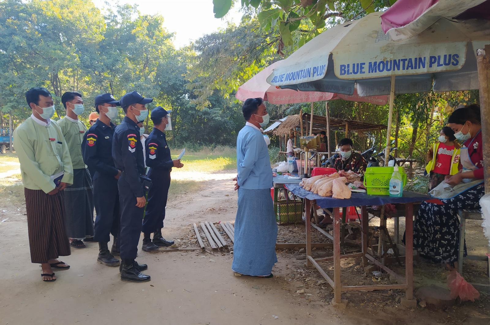 ကိုဗစ်–၁၉ ရောဂါ ကြိုတင်ကာကွယ် ထိန်းချုပ်နိုင်ရေးအတွက် မကွေးတိုင်းဒေသကြီး၊ မကွေးခရိုင်၊ မြို့သစ်မြို့နယ် ကိုဗစ်-၁၉ ထိန်းချုပ်ရေးနှင့် အရေးပေါ်တုံ့ပြန်ရေးကော်မတီနှင့် ပူးပေါင်းအဖွဲ့မှ ပြည်သူများ နေအိမ်အပြင်သို့ သွားလာ ရာတွင် Mask စနစ်တကျ တပ်ဆင်ခြင်း ရှိ/မရှိကို ယနေ့နံနက် ၉ နာရီအချိန်က စည်ပင်သာယာဈေး၊ ယာယီဈေးနှင့် အခွန်လွတ်စျေးတို့၌ ကွင်းဆင်း စစ်ဆေးခဲ့သည်။