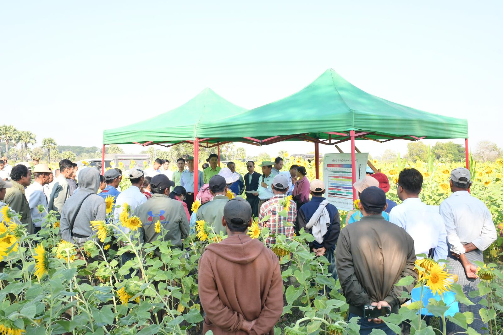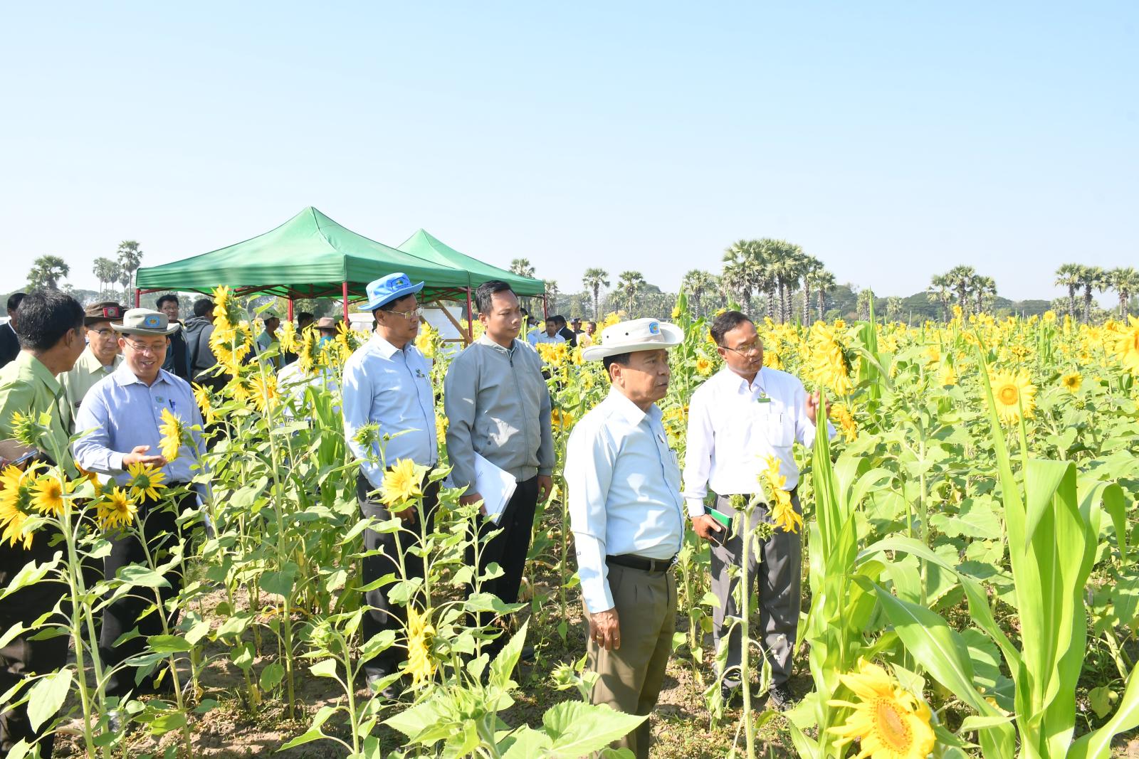 ထို့နောက် နေပြည်တော်ကောင်စီဥက္ကဋ္ဌ ဦးသန်းထွန်းဦးသည် တာဝန်ရှိသူများလိုက်ပါလျက် ဥသျှစ်ကုန်းကျေးရွာအုပ်စု၊ သပြေသာကျေးရွာ၊ ကွင်းအမှတ်(၁၂၇၉) တောင်သူ ဦးဇော်မိုး၏ ဆီထွက်သီးနှံ ဆင်းရွှေကြာ(၂) နေကြာစိုက်ခင်းများ အောင်မြင်ဖြစ်ထွန်းနေမှုကို ကြည့်ရှုအားသည်။