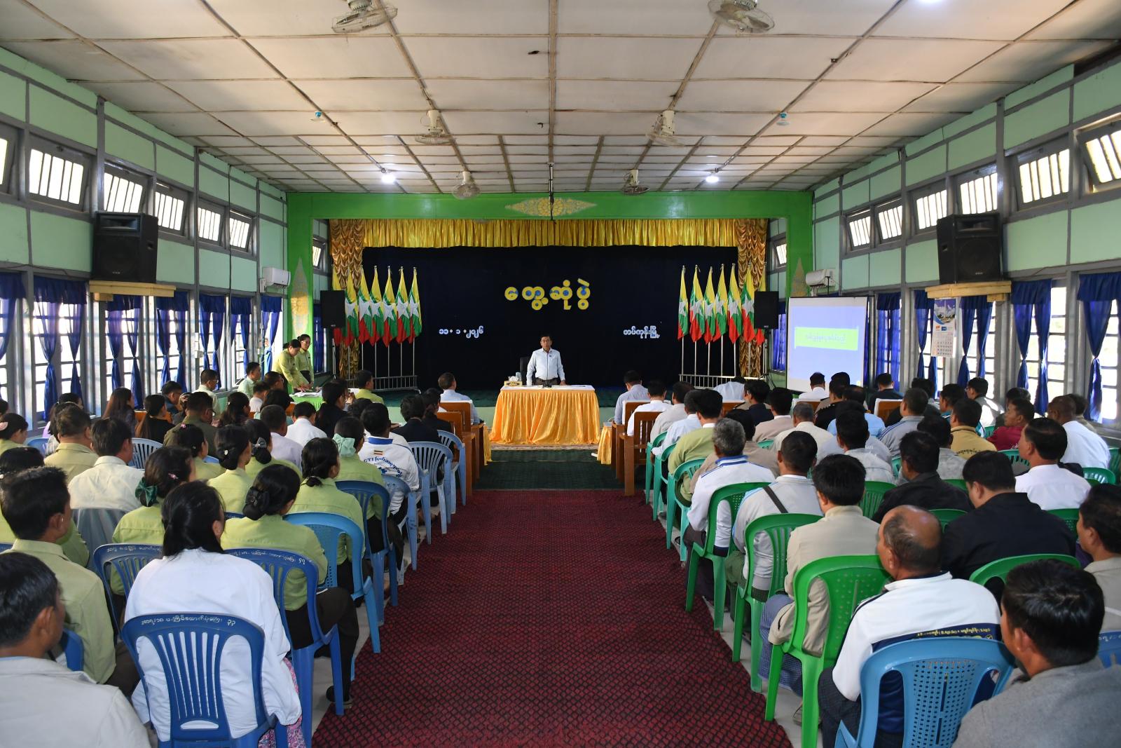 ဦးစွာ တပ်ကုန်းမြို့နယ် စီမံခန့်ခွဲရေးနှင့်အုပ်ချုပ်ရေးကော်မတီဥက္ကဋ္ဌ ဦးအောင်သူက မြို့နယ်၏ ဒေသဆိုင်ရာအချက်အလက်များနှင့်စပ်လျဉ်း၍ ရှင်းလင်းတင်ပြသည်။