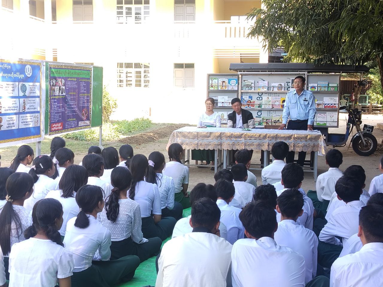 ထို့နောက် ‌ကျောင်းသား၊ ကျောင်းသူများက ပြန်ကြားရေးနှင့်ပြည်သူ့ဆက်ဆံရေးဦးစီးဌာန နယ်လှည့်စာကြည့်တိုက်သုံးဘီးယာဉ်မှ သုတ/ရသစာအုပ်‌ စာစောင်များနှင့် ခင်းကျင်းပြသထားသော မူးယစ်ဆေးဝါးအန္တရာယ်သိမှတ်ဖွယ်နှင့် ကလေးအလုပ်သမားပပျောက်ရေး၊ စာဖတ်ရှိန်မြှင့်တင်ရေးအသိပညာပေး နံရံကပ်စာစောင်များကို စိတ်ဝင်တစား ဖတ်ရှုလေ့လာကြကြောင်းသိရသည်။