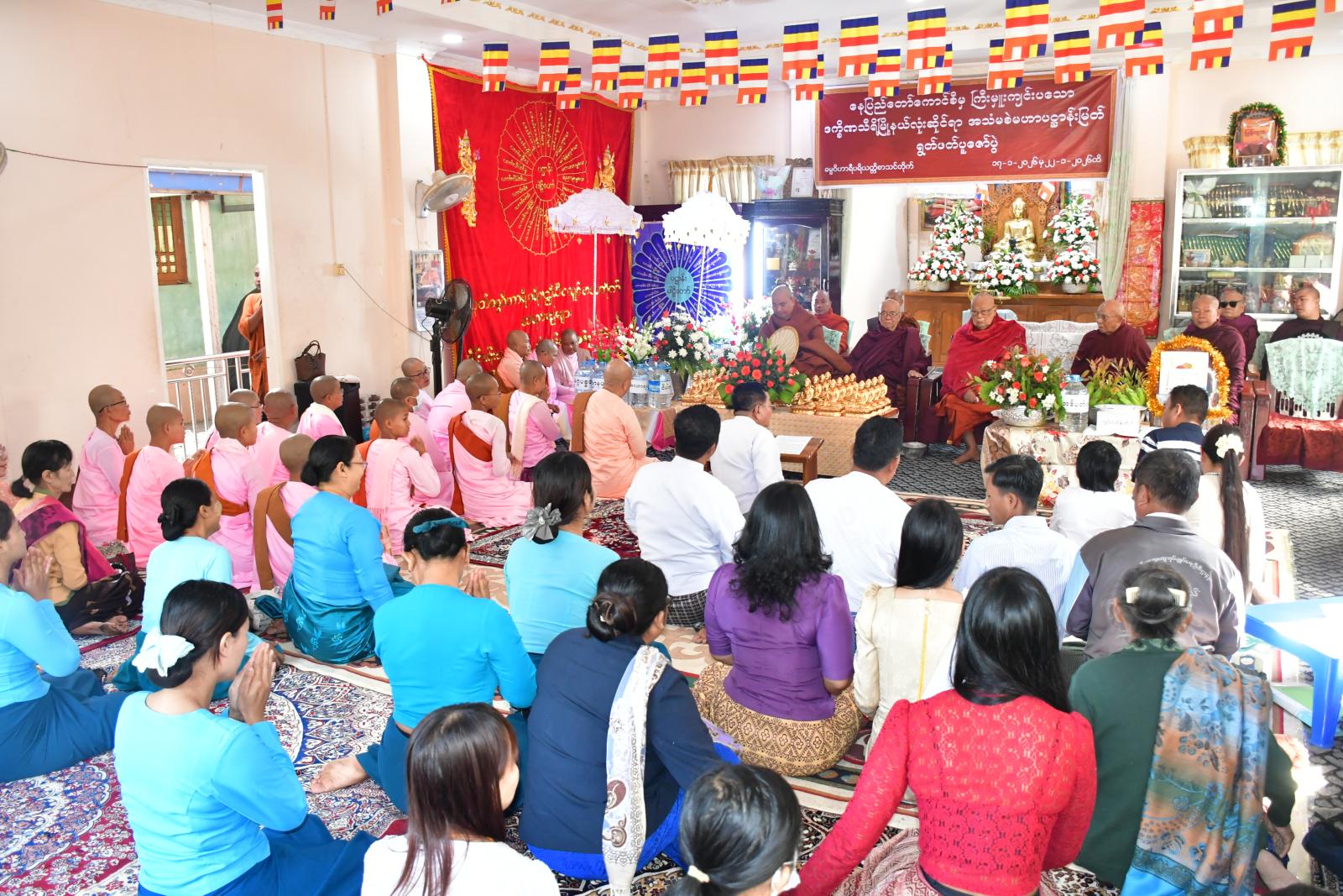 ဦးစွာ “နမောတဿ” သုံးကြိမ်ရွတ်ဆိုဘုရားကန်တော့၍ အခမ်းအနားကိုဖွင့်လှစ်ကာ သီလရှင် ဆရာတော်လေးများက ဘုရားပင့်နှင့် ပဋ္ဌာန်းရောင်ခြည်တော်ဖွင့်ဂါထာကိုရွတ်ဖတ်ပူ ဇော်ခြင်းနှင့် ဒေဝနိမန္တနဂါထာကိုဖတ်ကြား၍ နတ်ဗြဟ္မာများကို ပင့်ဖိတ်ခြင်းများကို ဆောင်ရွက်ကြ သည်။