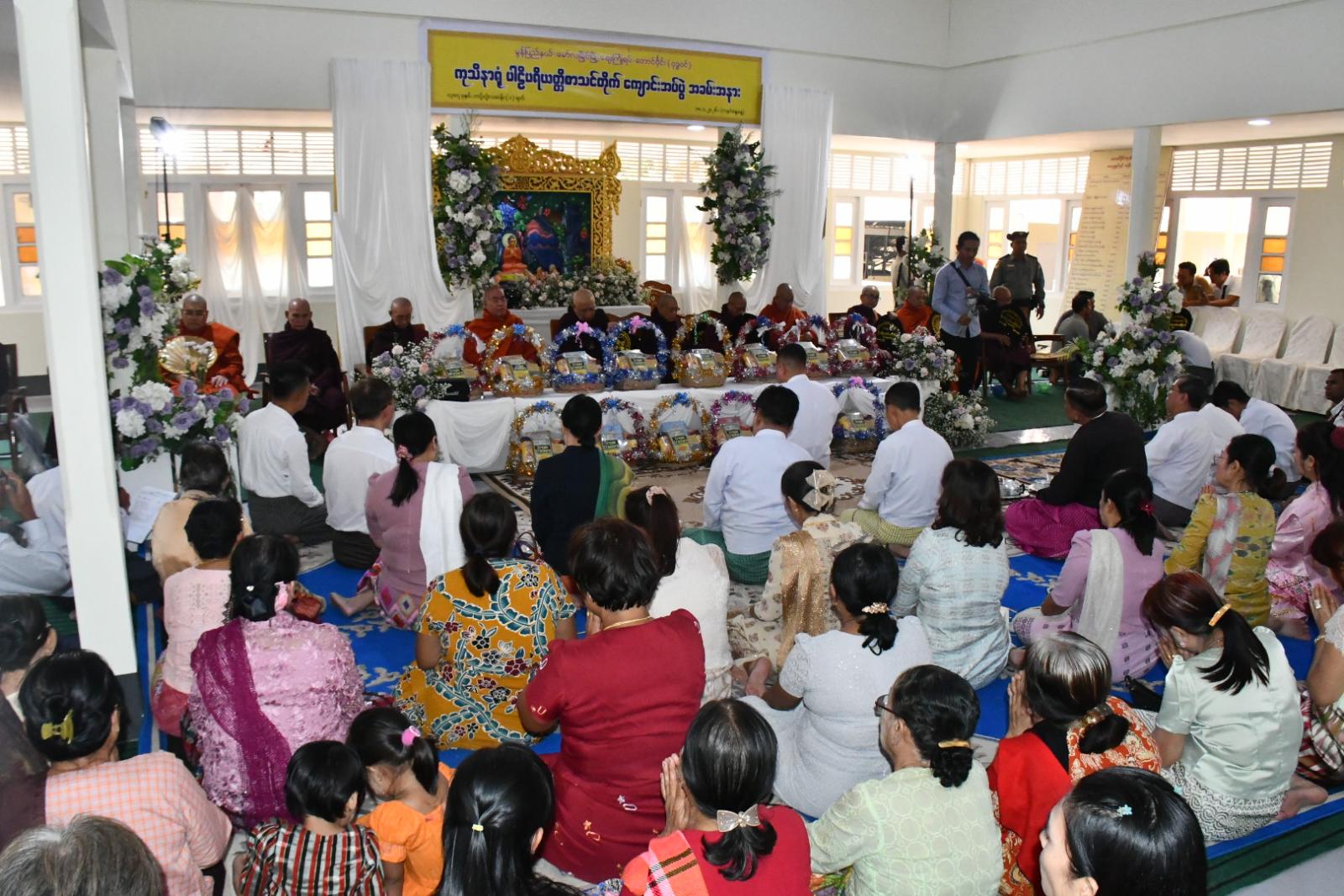 ထို့နောက် ဆရာတော်၊ သံဃာတော်အရှင်သူမြတ်များထံ ပြည်နယ်ဝန်ကြီးချုပ်၊ ပြည်နယ်တရားလွှတ်တော်တရားသူကြီးချုပ်နှင့် ပြည်နယ်ဝန်ကြီးများက လှူဖွယ်ဝတ္ထုပစ္စည်းများ ဆက်ကပ်လှူဒါန်းခဲ့ကြပြီး မော်လမြိုင်မြို့၊ လှိုင်ရပ်ကွက်၊ ရွှေတောင်ကျောင်းဆရာတော် ဘဒ္ဒန္တဝိမလ၊ (အဂ္ဂမဟာသဒ္ဓမ္မဇောတိကဓဇ၊ ဓမ္မကထိကဗဟုဇနဟိတဓရ၊ ဂန္တဝါစကပဏ္ဍိတ)ထံမှ အနုမောဒနာတရား နာယူကြည်ညို၍ လှူဒါန်းမှုအစုစုတို့အတွက် ရေစက်သွန်းချအမျှပေးဝေခဲ့ကြကာ အခမ်းအနားကို “ဗုဒ္ဓသာသနံစိရံတိဋ္ဌတု သုံးကြိမ်ရွတ်ဆိုဆုတောင်းကာ ဆရာတော်သံဃာတော်များအား နေ့ဆွမ်းဆက်ကပ်လှူဒါန်းခဲ့သည်။