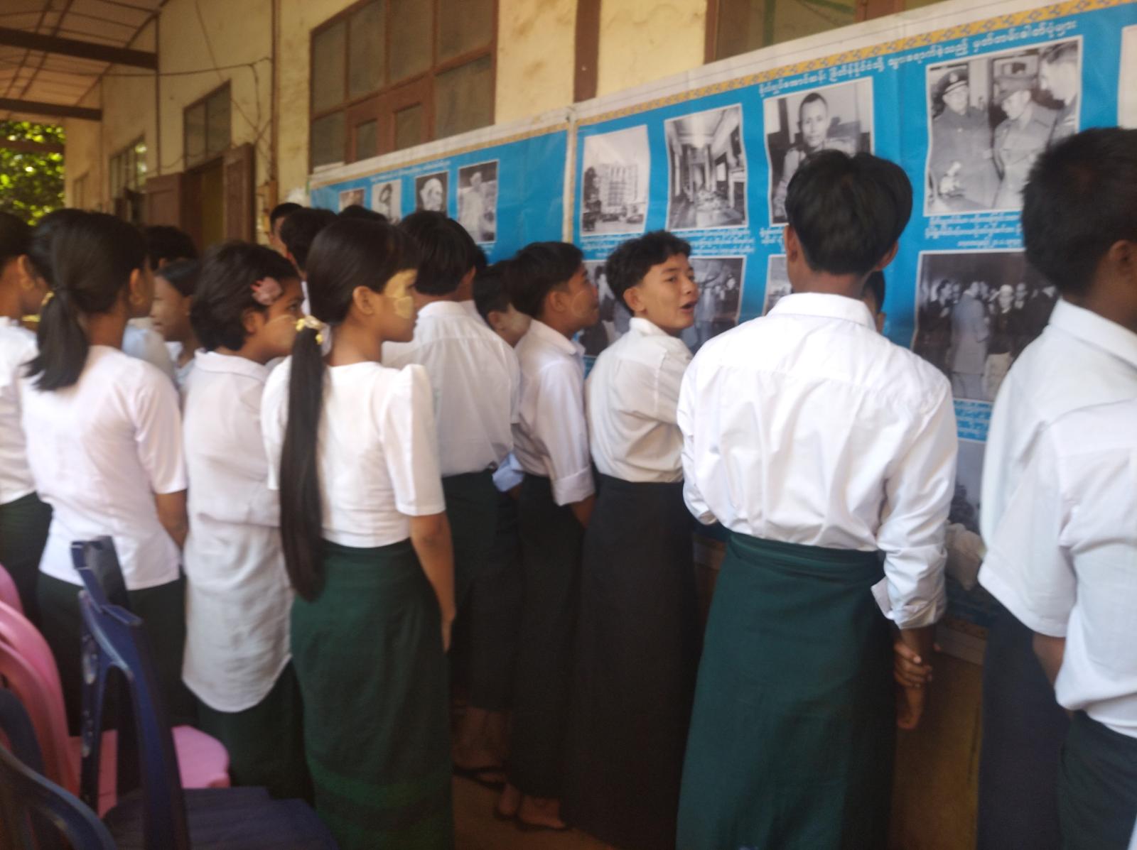 ထို့နောက် ကျောင်းသား၊ ကျောင်းသူများအား အသိပညာ ဗဟုသုတ ရရှိစေရေးအတွက် နယ်လှည့်စာကြည့်တိုက်လှုပ်ရှားမှုအဖြစ် ဒုတိယဦးစီးစီးမှူးဦးမျိုးငြိမ်းနှင့်ဝန်ထမ်းများက နံရံကပ်စာစောင်နှင့်သုတ၊ ရသ စာအုပ်စာစောင်များအားပြသခဲ့ရာ ကျောင်းသား၊ကျောင်းသူများက စိတ်ပါဝင်စားစွာ လေ့လာဖတ်ရှု့ကြကြောင်း သိရသည်။