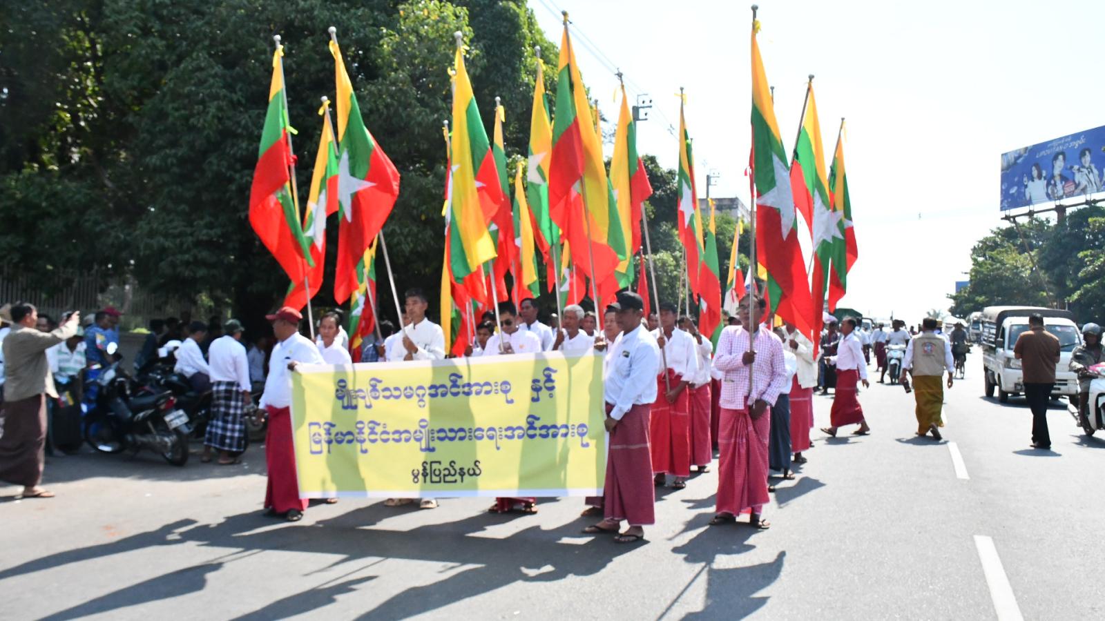 ထို့နောက် ကြိုဆိုထောက်ခံပွဲ အခမ်းအနားကိုကျင်းပရာ ဦးစွာမွန်ပြည်နယ်အတွင်းရှိ တိုင်းရင်းသားပေါင်းစုံတို့က နိုင်ငံတော်အလံအားအလေးပြု၍ နိုင်ငံတော်သီချင်းအား သံပြိုင်သီဆိုခဲ့ကြသည်။