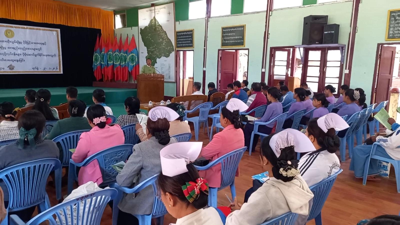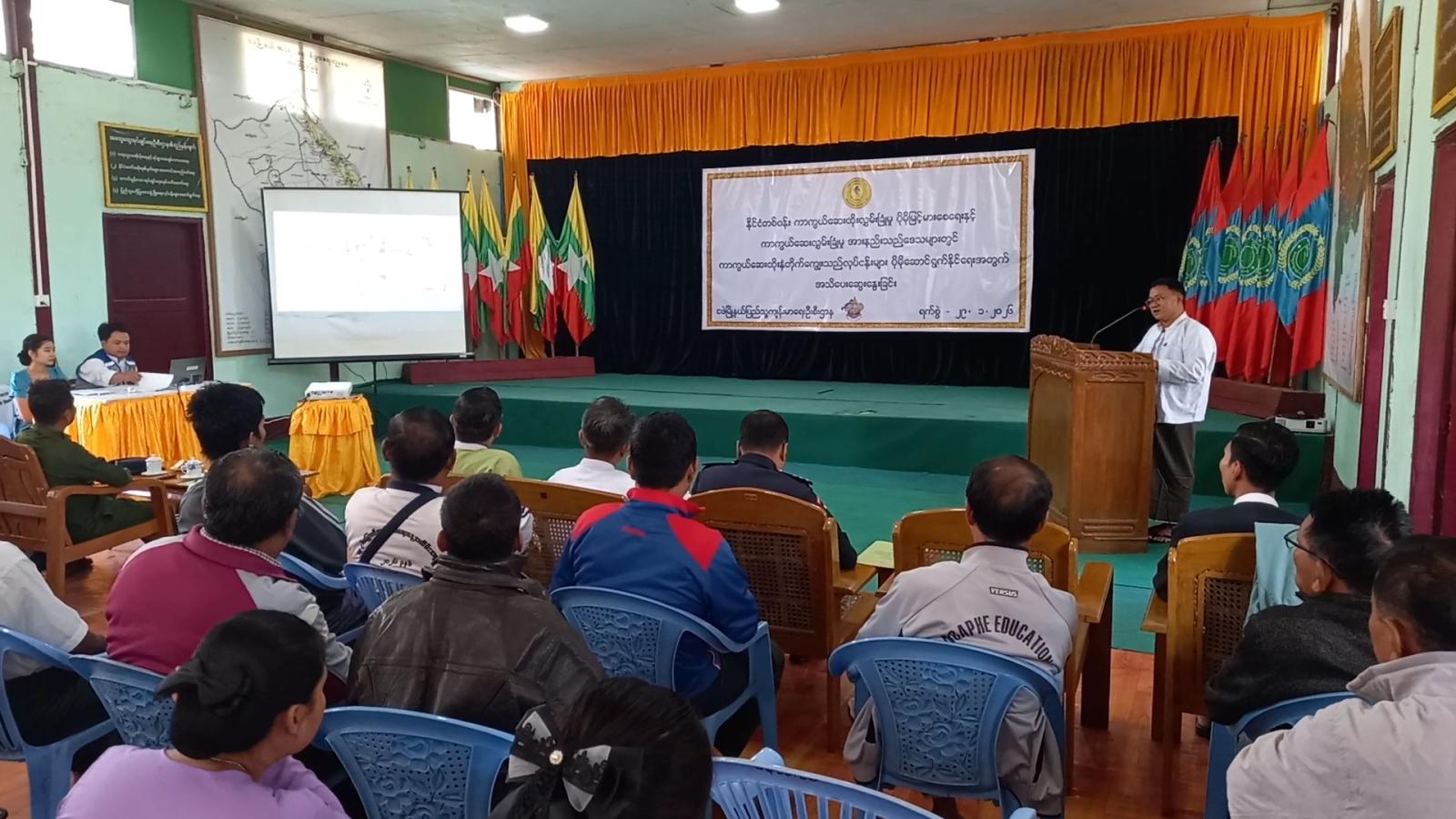 ဆက်လက်၍ မြို့နယ်ပြည်သူ့ကျန်းမာရေးနှင့်ကုသရေးဦးစီးဌာနမှူး ဒေါက်တာအုန်းဝင်းက မြို့နယ်အတွင်း ကာကွယ်ဆေးထိုးလွှမ်းခြုံမှု ပိုမိုမြင့်မားစေရေးနှင့် ကာကွယ်ဆေး လွှမ်းခြုံမှုအားနည်းသည့်ဒေသများတွင် ကာကွယ်ဆေးထိုးနှံတိုက်ကျွေးသည့်လုပ်ငန်းများ၊ တိုးချဲ့ကာကွယ် ဆေးထိုးနှံတိုက်ကျွေးခြင်း၏ အဓိကရည်ရွယ်ချက်များနှင့် သွားလာရေး ခက်ခဲသောဒေသများ၊ ပြောင်းရွှေ့ရောက်ရှိလာသည့် ကလေးငယ်များအား ကာကွယ်ဆေးထိုးနှံတိုက်ကျွေးခြင်းလုပ်ငန်းများ အားဖြည့်ဆောင်ရွက်နိုင်ရန်အတွက် အကောင်အထည်ဖော်ဆောင်ရွက်နိုင်မည့် လုပ်ငန်းစဉ်များကို Power Point ဖြင့် အသေးစိတ် ရှင်းလင်းဆွေးနွေးသည်။