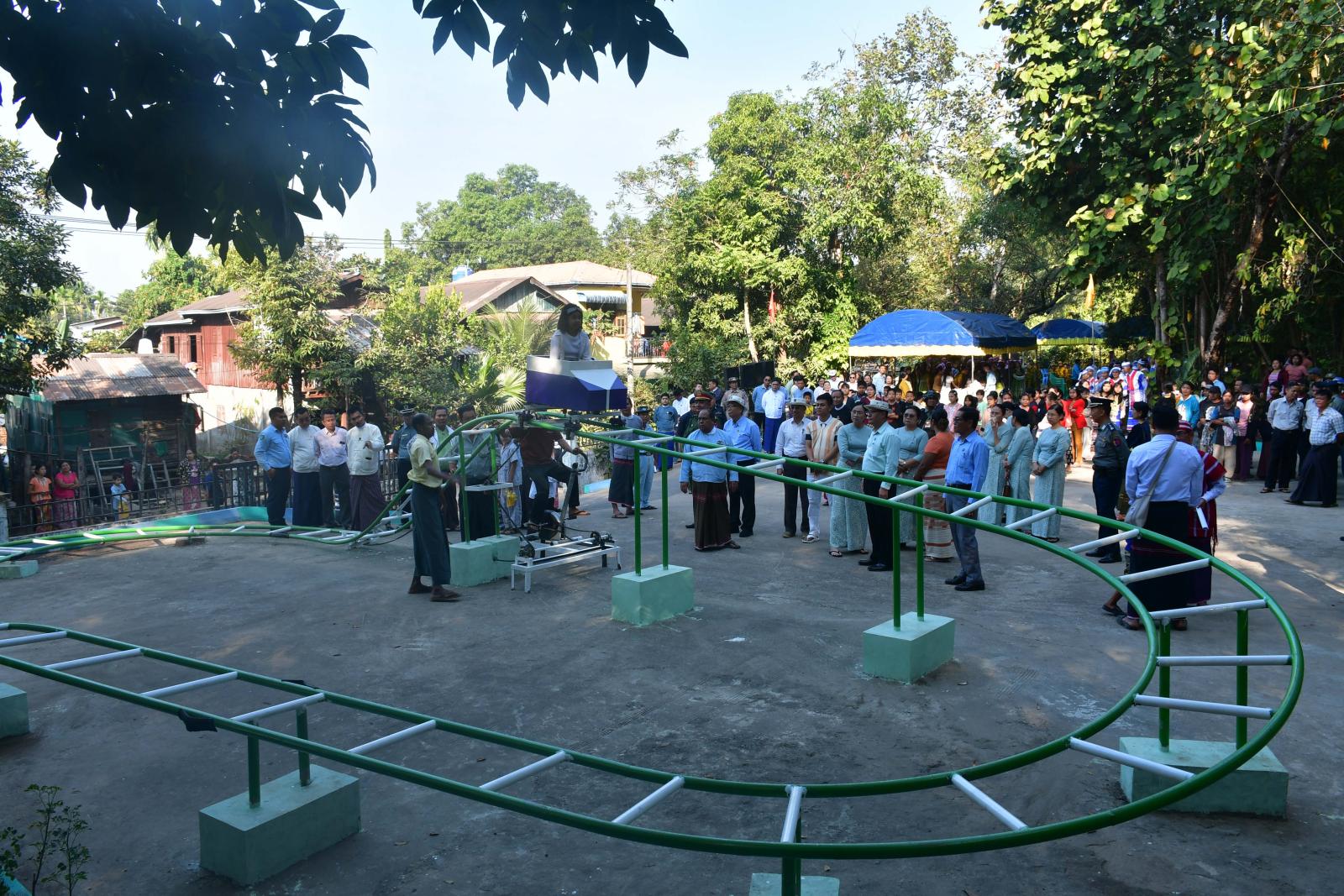 ထို့နောက် ပြည်နယ်ဝန်ကြီးချုပ်က လူစီး Cable Slide ဆိုင်းဘုတ်နှင့် ကမ္ပည်းမော်ကွန်းတို့အား စက်ခလုပ်နှိပ်ဖွင့် လှစ်ပေးပြီး တက်ရောက်လာသူများနှင့်အတူ အမွှေးနံ့သာရည်များ ပက်ဖြန်းပေးကြပြီး ဝန်ထမ်းများက Cable Slide စီးနင်းပြသခြင်းနှင့် ကယ်ဆယ်ရေးစနစ်များ သရုပ်ပြခြင်းကို ကြည့်ရှုအားပေးကာ မိသားစုအလိုက်ကလေးငယ်များမှခြေနင်း အပျော်စီးရထားကို ပျော်ရွင်စွာစီးနင်း ကစားနေမှုအား လှည့်လည်ကြည့်ရှုအားပေး၍ ကလေးများကို အရုပ်နှင့်မုန့်များ ဝေငှပေးခဲ့ကြသည်။