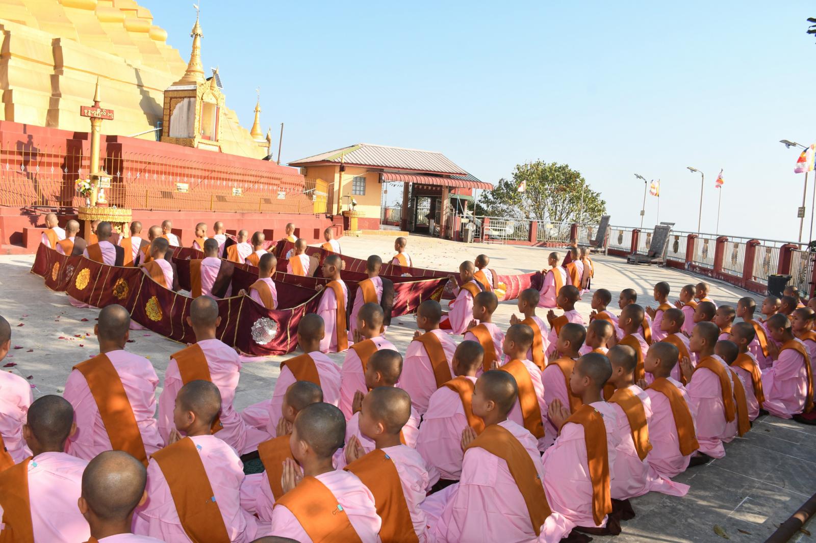 ဦးစွာ ပဉ္စဂီရိချမ်းမြေ့စည် လောကီလောကုတ္တရာ ပညာသင်ကြားရေး သီလရှင်ကျောင်းမှ သီလရှင် ဆရာကြီး၊ ဆရာလေးများက ကြာသင်္ကန်းတော်အား စီတန်းကိုင်ဆောင်ကာ စေတီတော်မြတ်ကြီးအား လက်ယာရစ် သုံးကြိမ်လှည်လည်ပူဇော်ကြပြီး သထုံမြို့၊ ရွှေတောင်ကျောင်းတိုက် ပဓာနနာယက၊ ဘန္ဒန္တသုစရိတထံမှ သီလရှင်ဆရာကြီး၊ ဆရာလေးများနှင့် တက်ရောက်လာသည့် ဧည့်ပရိသတ်အပေါင်းတို့က သီလခံယူဆောက်တည်ကြသည်။